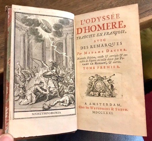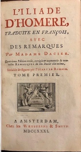 L’Iliade d’Homere, traduite en françois, avec des remarques par Madame Dacier. Quatrieme Edition, revue, corrigée & augmentée de nouvelles remarques de M. Dacier elle-même, enrichie de figures en taille douce par Picart le Romain. Tome premier (. Tome troisieme). L’Odyssée d’Homere. Nouvelle Edition. Tome premier (. Tome troisieme)