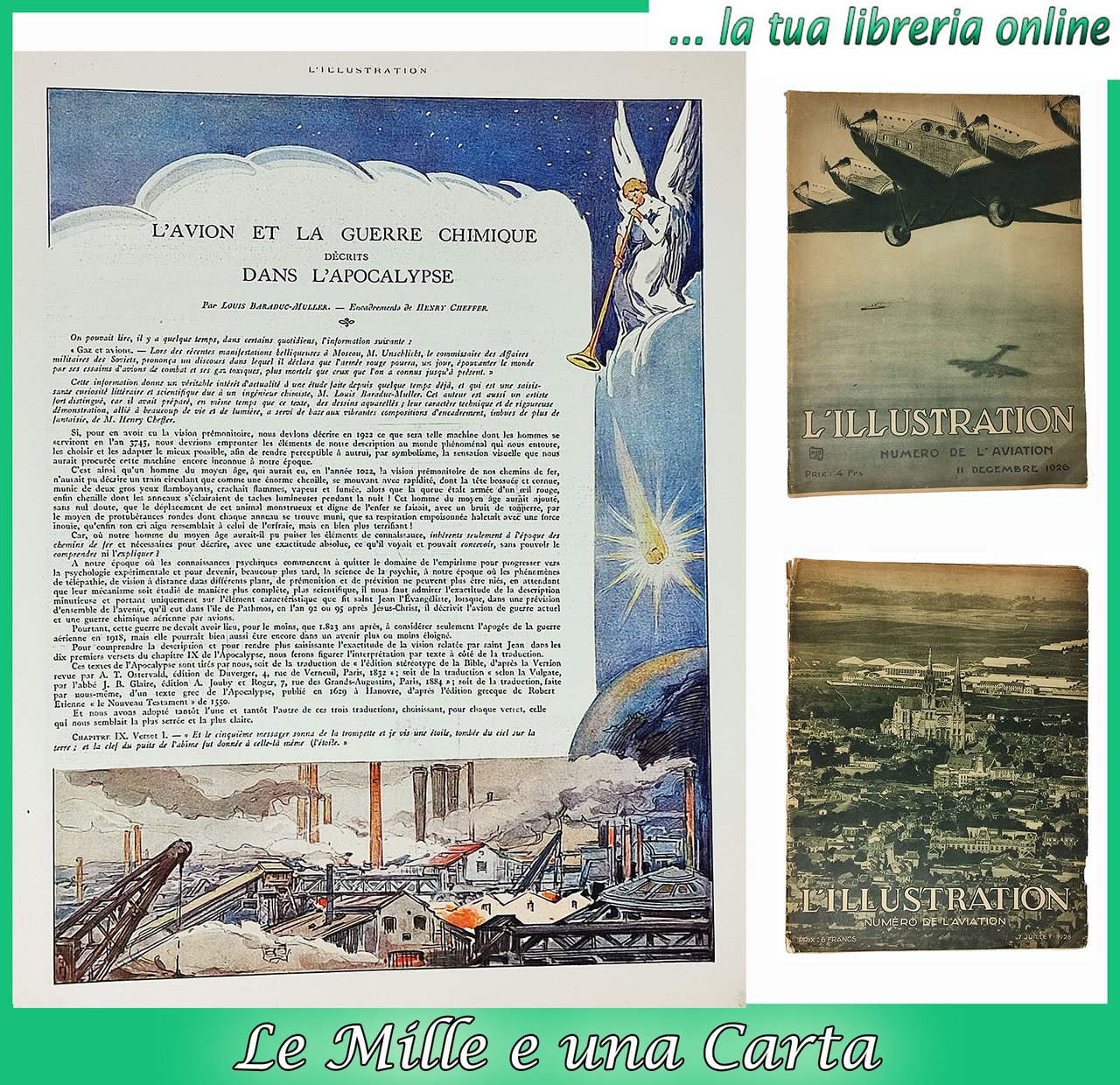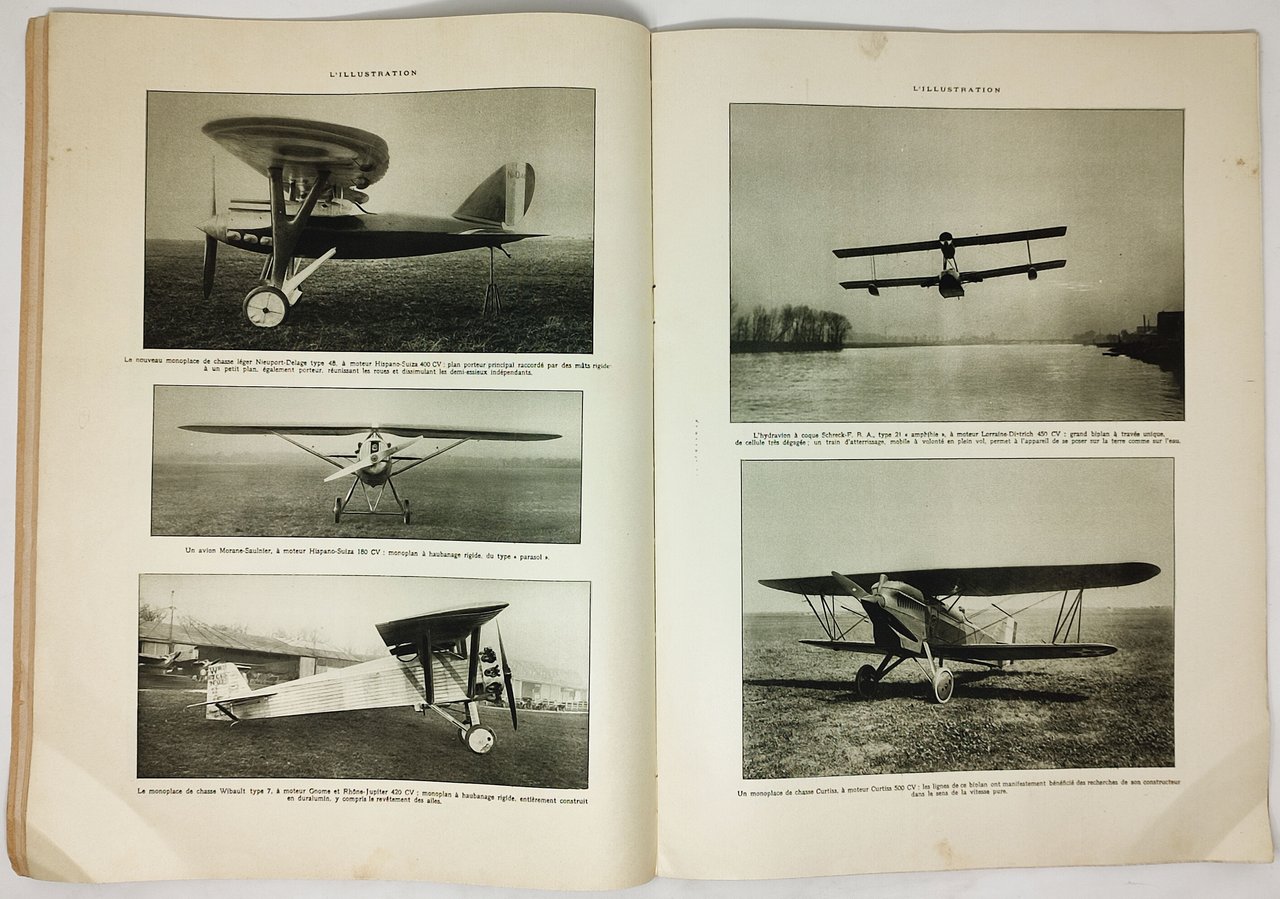 Lotto composto da due numeri del celebre giornale illustrato francese 'L'ILLUSTRATION', dedicati al tema dell'aviazione. 1) numero del 11 dicembre 1926 (84° Année - n° 4371), 2) numero del 28 luglio 1928. Directeur. René Baschet Rédacteur en chef: Gaston Sorbets. Lingua del testo: francese. Dimensioni di ciascun giornale: 30 x cm circa. Numero di pagine: LVI+ [31] (numero del 1926); 36 (numero del 1928). Stato di conservazione: il numero del 11 dicembre 1926 presenta un'ammaccatura (sull'angolo inferiore) che ha provocato delle leggere 'orecchie' delle pagine, mimuscoli strappetti sui margini del dorso, il fascicolo centrale (di 4 pagine) è attaccato al corpo del giornale solo più attraverso una graffetta metallica (si è staccato dalla seconda) ma, nel complesso, un buon esemplare. Privo di scritte, sottolineature, timbri o firme d'appartenenza. Il numero del 7 luglio 1928 presenta vistosi strappi e abrasioni sul dorso, la copertina è attaccata al corpo del volume solo più attraverso una delle due graffette metalliche della rilegatura, piccoli strappetti (con, anche, qualche piccola mancanza) sui bordi dei piatti della copetina, qualche piega e lieve stropicciatura sui vertici delle pagine interne, qualche leggera macchiolina e brunitura di qualche pagina ma, nel complesso, un esemplare più che discretamente conservato. Privo di scritte, sottolineature, timbri o firme di appartenenza. Il numero del 1926 presenta numerose pagine di bellissime pubblicità d'epoca. Giornali illustrati con numerose figure (per lo più fotografiche) in nero nel testo. Il numero del 1928 presenta un inserto intitolato 'L'AVION ET LA GUERRE CHIMIQUE DECRITS DANS L'APOCALYPSE' illustrato a colori con splendidi disegni (in tipico stile dell'epoca) di Henry Cheffer.