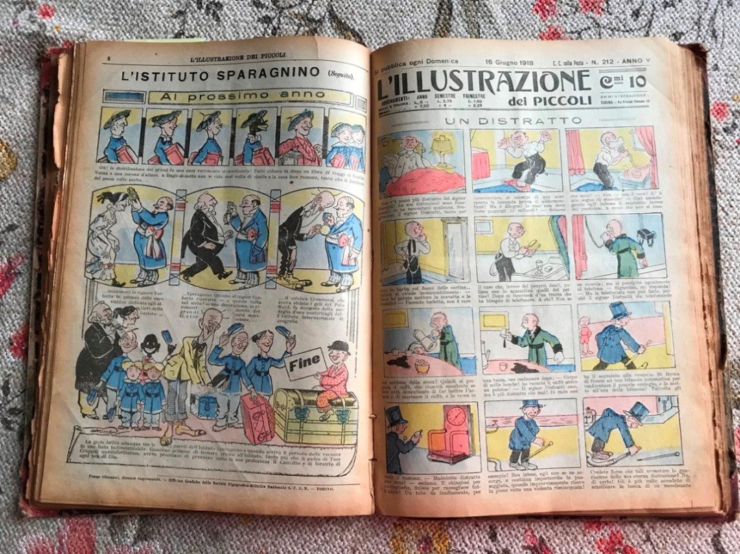 Volume in 4, legatura coeva in mezza tela (mancanze al dorso). Interamente illustrato a colori e in b.n. (molte storie sono a tutti gli effetti fumetti, anche se col testo in calce anzich nelle consuete nuvolette). Quinta annata di questo periodico per l'infanzia diretto da Giovanni Ponzio. Il periodico visse dal 1914 al 1928 (anno in cui si fuse con Piccolo Mondo) e fu, sostanzialmente, l'edizione italiana con mutato titolo del settimanale francese Le Petit Illustr dei fratelli Offenstadt. Fra gli illustratori presenti si segnalano Louis Forton (che vi cre il celebre personaggio di Bibi Fricotin), E. Nicolson, Briol, Nadal, ecc. Sono presenti piccoli strappi ad alcune pagine. In buone condizioni generali, raro a reperirsi.