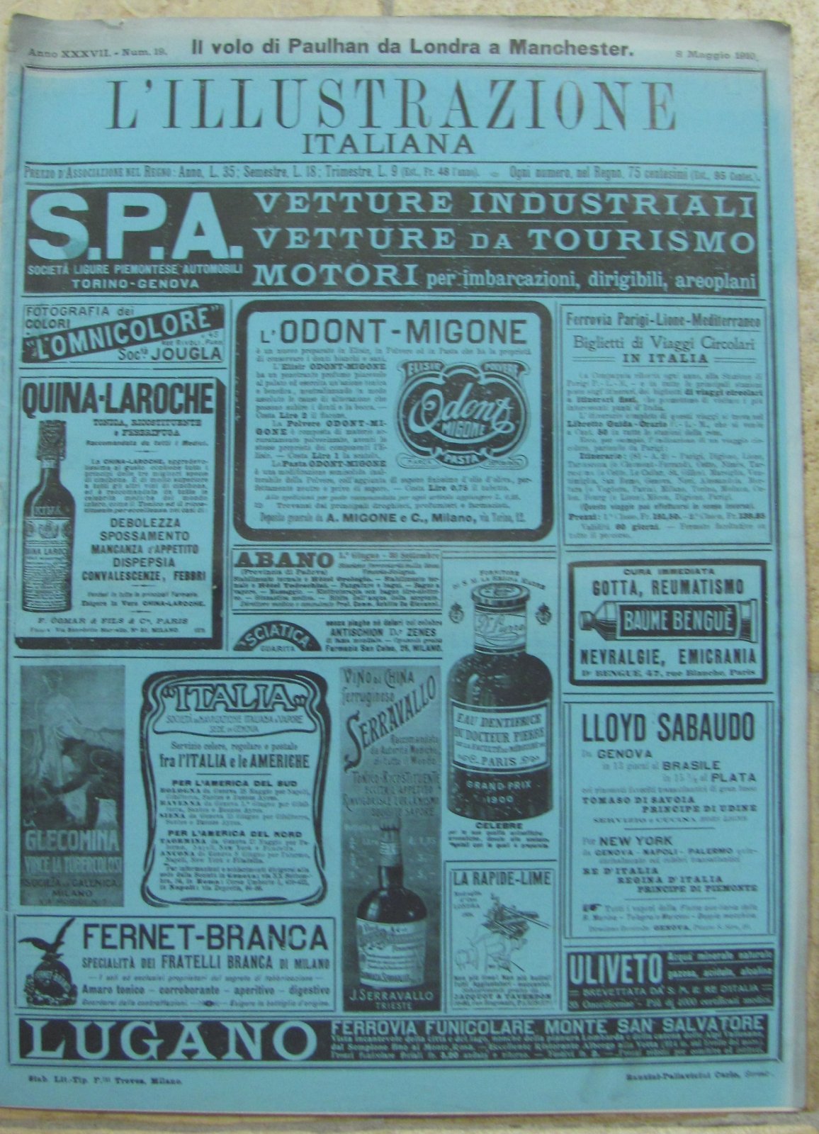 L'ILLUSTRAZIONE ITALIANA 8 MAGGIO 1910 ARGOMENTI IL VOLO DI PAULHAN DA LONDRA A MANCHESTER- INAUGURAZIONE DELL'ESPOSIZIONE DELLE BELLE ARTI A VENEZIA- LA CONFERENZA DEL PRINCIPE DI MONACO A ROMA- LA FINE DEL DIRIGIBILE ZEPPELIN II- UNA FIDANZATA NOVELLA COPERTINA IN CARTA AZZURRA LEGGERMENTE SBIADITA AI MARGINI, DA PAG. 458 A PAG.480