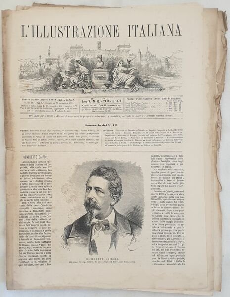 Numero del 24 marzo 1878 dell'Illustrazione italiana. Il volume in folio è riccamente illustrato da incisioni nel testo e fuori testo. All'interno: Benedetto Cairoli Le incisioni: Benedetto Cairoli, Napoli, Venezia: Funerali del Re, Esposizione universale di Parigi, Entrata del Principe di Siberia a Nissa, Illuminazione a San Pietroburgo ecc. In buone condizioni. Copertina editoriale in buone condizioni con lievi usure ai margini e dorso. Legatura editorialmente assente. Pagine in buone condizioni con fioriture. Piegatura orizzontale. In folio cm 38,5x27,5. Pp. da 193 a 208Number of 24th of march 1878 of Illustrazione italiana. The volume in folio is richly illustrated by engravings in the text and out of text. Inside: Benedetto Cairoli The prints: Benedetto Cairoli, Napoli, Venezia: Funerals of the King, Universal Esposition of Paris, Entry of Prince of Siberia in Nice, Lighting in San Pietroburgo In good conditions. Editorial cover in good conditions slightly won in the extremities. Binding editorialrly lacks. Pages are in good conditions with foxing. Horizontal folding. In folio cm 38,5x28. Pp. 193 to 208