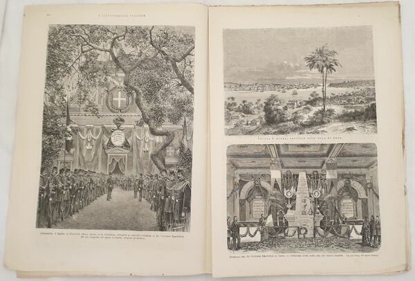 Numero del 31 marzo 1878 dell'Illustrazione italiana. Il volume in folio è riccamente illustrato da incisioni nel testo e fuori testo. All'interno: Funerali del Re Vittorio Emanuele al Cairo, Cuba e la sua rivoluzione, Il Minotaur a Malta, Cascata del Niagara, Fonografo del Sig. D'Edison Le incisioni: Alessandria d'Egitto Chiesa Santa Caterina, Havana di Cuba, Funerali del Re Vittorio Emanuele al Cairo, San Stefano, Roma: alla Rassegna militare del Macao, Cascata del Niagara, La nave ammiraglia inglese Minotaur nel porto di Malta, S. Stefano ecc. In buone condizioni. Copertina editoriale in buone condizioni con lievi usure ai margini e dorso. Legatura editorialmente assente. Pagine in buone condizioni con fioriture. Piegatura orizzontale. In folio cm 38,5x27,5. Pp. da 209 a 224Number of 31st of march 1878 of Illustrazione italiana. The volume in folio is richly illustrated by engravings in the text and out of text. Inside: Funerals of the King Vittorio Emanuele al Cairo, Cuba and its revolution, Minotaur in Malta, Niagara, Phonographer of Sig. D'Edison The prints: Alessandria d'Egitto Church Santa Caterina, Havana di Cuba, Funerals of the King Vittorio Emanuele in Cairo, San Stefano, Rome: alla Rassegna militare del Macao, Niagara, The english ship Minotaur in the harbour of Malta, S. Stefano ecc. In good conditions. Editorial cover in good conditions slightly won in the extremities. Binding editoriarly lacks. Pages are in good conditions with foxing. Horizontal folding. In folio cm 38,5x27,5. Pp. da 209 a 224
