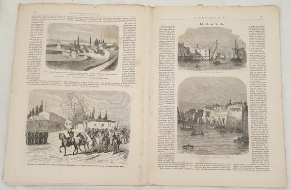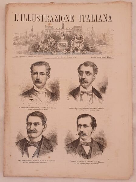 Numero del 7 aprile 1878 dell'Illustrazione italiana. Il volume in folio è riccamente illustrato da incisioni nel testo e fuori testo. All'interno: I russi presso Costantinopoli, Scavi di Roma, Esposizione Universale di Parigi Le incisioni: Membri del Governo Italiano (Giuseppe Bruzzo, Alfredo Baccarini, Raffaele Conforti, Federico Seismit Doda), San Stefano il punto di confine tra l'esercito russo e l'esercito turco, Recenti scavi di ROma (Tensa Capitolina), Ponte rotto dai Turchi, Entrata del generale Principe Oldenburg, Il porto di Malta, Il forte della Valletta a Malta, Veduta di Tcekmedge ecc. In buone condizioni. Copertina editoriale in buone condizioni con lievi usure ai margini e dorso. Legatura editorialmente assente. Pagine in buone condizioni con fioriture. Piegatura orizzontale. In folio cm 38,5x27,5. Pp. da 225 a 240Number of 7th of april 1878 of Illustrazione italiana. The volume in folio is richly illustrated by engravings in the text and out of text. Inside: I russi presso Costantinopoli, Scavi di Roma, Esposizione Universale di Parigi The engravings: Members of Italian government (Giuseppe Bruzzo, Alfredo Baccarini, Raffaele Conforti, Federico Seismit Doda), San Stefanothe meeting point between russian and turkish army, (Tensa Capitolina), Prince Oldenburg, the Harbour of Malta, the fort of La Valletta in Malta, View of Tcekmedge In good conditions. Editorial cover in good conditions slightly won in the extremities. Binding editoriarly lacks. Pages are in good conditions with foxing. Horizontal folding. In folio cm 38,5x27,5. Pp. from 225 to 240