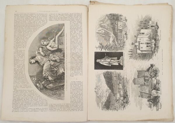 Numero del 21 aprile 1878 dell'Illustrazione italiana. Il volume in folio è riccamente illustrato da incisioni nel testo e fuori testo. All'interno: Andrea Appiani, Cadore Le incisioni: Portico superiore nel Palazzo Vitelleschi in Corneto Tarquinia, Cadore, Costantinopoli Santa Sofia, Il Principe di Napoli, Roma Fontana di Villa Giulia, Roma Loggia del Palazzo Farnese ecc. In buone condizioni. Copertina editoriale in buone condizioni con lievi usure ai margini e dorso. Legatura editorialmente assente. Pagine in buone condizioni con fioriture. Piegatura orizzontale. In folio cm 38,5x27,5. Pp. da 257 a 272. Number of 21st of april 1878 of Illustrazione italiana. The volume in folio is richly illustrated by engravings in the text and out of text. Inside: Andrea Appiani, Cadore The engravings: Upper flat in Palazzo Vitelleschi in Corneto Tarquinia, Cadore, Costantinopoli Santa Sofia, Prince of Naples, Rome Fountain of Villa Giulia, Roma Lodge of Palazzo Farnese In good conditions. Editorial cover in good conditions slightly won in the extremities. Binding editoriarly lacks. Pages are in good conditions with foxing. Horizontal folding. In folio cm 38,5x27,5. Pp. from 257 to 272