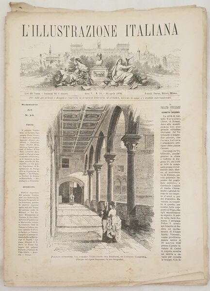Numero del 21 aprile 1878 dell'Illustrazione italiana. Il volume in folio è riccamente illustrato da incisioni nel testo e fuori testo. All'interno: Andrea Appiani, Cadore Le incisioni: Portico superiore nel Palazzo Vitelleschi in Corneto Tarquinia, Cadore, Costantinopoli Santa Sofia, Il Principe di Napoli, Roma Fontana di Villa Giulia, Roma Loggia del Palazzo Farnese ecc. In buone condizioni. Copertina editoriale in buone condizioni con lievi usure ai margini e dorso. Legatura editorialmente assente. Pagine in buone condizioni con fioriture. Piegatura orizzontale. In folio cm 38,5x27,5. Pp. da 257 a 272Number of 21st of april 1878 of Illustrazione italiana. The volume in folio is richly illustrated by engravings in the text and out of text. Inside: Andrea Appiani, Cadore The engravings: Upper flat in Palazzo Vitelleschi in Corneto Tarquinia, Cadore, Costantinopoli Santa Sofia, Prince of Naples, Rome Fountain of Villa Giulia, Roma Lodge of Palazzo Farnese In good conditions. Editorial cover in good conditions slightly won in the extremities. Binding editoriarly lacks. Pages are in good conditions with foxing. Horizontal folding. In folio cm 38,5x27,5. Pp. from 257 to 272