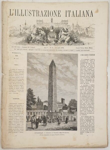 Numero del 28 aprile 1878 dell'Illustrazione italiana. Il volume in folio è riccamente illustrato da incisioni nel testo e fuori testo. All'interno: Andrea Appiani, Cadore Le incisioni: Costantinopoli obelisco di Teodosio, Roma la Societa protettrice degli animali, Il supplizio di ufficiali polacchi al Servizio turco, A Montecitorio, Costumi olandesi, Antonio Scialoja ecc. In buone condizioni. Copertina editoriale in buone condizioni con lievi usure ai margini e dorso. Legatura editorialmente assente. Pagine in buone condizioni con fioriture. Piegatura orizzontale. In folio cm 38,5x27,5. Pp. da 273 a 288Number of 28th of april 1878 of Illustrazione italiana. The volume in folio is richly illustrated by engravings in the text and out of text. Inside: Andrea Appiani, Cadore The engravings: Costantinopoli obelisk of Teodosio, Rome the Societa protettrice degli animali, Poland officiers to turkish Service, Montecitorio, Costumi olandesi, Antonio Scialoja In good conditions. Editorial cover in good conditions slightly won in the extremities. Binding editoriarly lacks. Pages are in good conditions with foxing. Horizontal folding. In folio cm 38,5x27,5. Pp. from 273 to 288