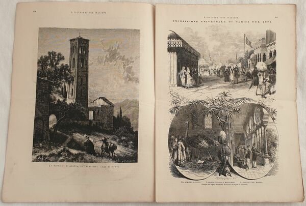 Numero del 9 giugno 1878 dell'Illustrazione italiana. Il volume in folio è riccamente illustrato da incisioni nel testo e fuori testo. All'interno: L'esposizione Universale, Iside, La Torre di Sant'Andrea, La Sibilla Persica del Guercino, da Roma a Fiumicino, Illuminazione della Piazza San Marco, Impressioni torinesi, Lord John Russell, Giudizi della stampa sulla Guida di Parigi di Folchetto Le incisioni: La Torre di S. Andrea in Tremezzina Lago di Como, Esposizione Universale di Parigi del 1878, La Sibilla Persica, da Roma a Fiumicino, Illuminazione della Piazza San Marco, Mode In buone condizioni. Copertina editoriale in buone condizioni con lievi usure ai margini e dorso. Legatura editorialmente assente. Pagine in buone condizioni con fioriture. Piegatura orizzontale. In folio cm 38,5x27,5. Pp. da 369 a 384. Number of 9th of june 1878 of Illustrazione italiana. The volume in folio is richly illustrated by engravings in the text and out of text. Inside: Universal Exposition, Iside, The Tower of Sant'Andrea, Sibilla Persica del Guercino, from Rome to Fiumicino, Lighting of Piazza San Marco, Turin impressions, Lord John Russell, Judgement of publishing about the Guide of Paris by Folchetto The prints: Tower of S. Andrea in Tremezzina Lake of Como, Unviersal exposition of 1878, Sibilla Persica, from Rome to Fiumicino,Lighting of Piazza San Marco, Fashion In good conditions. Editorial cover in good conditions slightly won in the extremities. Binding editoriarly lacks. Pages are in good conditions with foxing. Horizontal folding. In folio cm 38,5x27,5. Pp. from 369 to 384