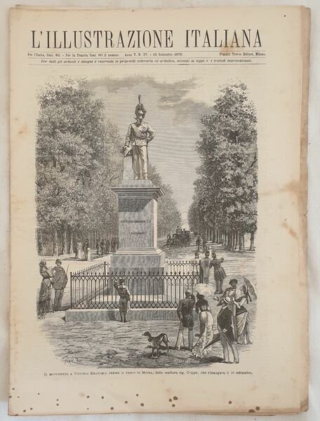 Numero del 15 settembre 1878 dell'Illustrazione italiana. Il volume in folio è riccamente illustrato da incisioni nel testo e fuori testo. All'interno: Monza e il primo monumento a Vittorio Emanuele, La caccia del falco, In viaggio per la Bosnia: Dalmazia ecc. Le incisioni: Il monumento a Vittorio Emanuele presso il parco di Monza, Monza l'interno del Duomo, Il palazzo comunale, Occupazione della Bosnia, Caccia al falco, Montelabro, La guerra in Bosnia ecc. In buone condizioni. Copertina editoriale in buone condizioni con lievi usure ai margini e dorso. Legatura editorialmente assente. Pagine in buone condizioni con fioriture. Piegatura orizzontale. In folio cm 38,5x28,5. Pp. da 161 a 176 Number of 15th of september 1878 of Illustrazione italiana. The volume in folio is richly illustrated by engravings in the text and out of text. Inside: Monza and the first monument to Vittorio Emanuele, in travel to Bosnia: Dalmazia The prints: the monument to Vittorio Emanuele near the park of Monza, Monza the interior of Duomo, comunal palace, Occupation of Bosnia, Montelabro, War in Bosnia ecc. In good conditions. Editorial cover in good conditions slightly won in the extremities. Binding editoriarly lacks. Pages are in good conditions with foxing. Horizontal folding. In folio cm 38,5x28,5. Pp. da 161 a 176