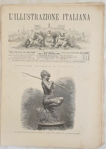 Numero del 29 settembre 1878 dell'Illustrazione italiana. Il volume in folio è riccamente illustrato da incisioni nel testo e fuori testo. All'interno: Ancora sul monumento di Tiziano, In Bosnia, Gli scavi concordiesi, la catastrofe del Tamigi, Agram o Zagabria capitale della Croazia, Dai confini della Bosnia, Il pescatore napoletano ecc. Le incisioni: Il pescatore napoletano, Facciata degli Stati Orientali Tunisi Siam Marocco Persia, Porta delle sezioni di belle Arti, Lo scontro della principessa Tamigi col Bywell castle sul Tamigi, Le feste di Mantova, Le feste di Brescia, Verona ecc. In buone condizioni. Copertina editoriale in buone condizioni con lievi usure ai margini e dorso. Legatura editorialmente assente. Pagine in buone condizioni con fioriture. Piegatura orizzontale. In folio cm 38,5x28,5. Pp. da 193 a 208Number of 29th of september 1878 of Illustrazione italiana. The volume in folio is richly illustrated by engravings in the text and out of text. Inside: The monument of Tiziano, In Bosnia, excavations, catastroph of Tamigi, Agram or Zagabria capiutal of Croazia, from borders of Bosnia, the Neapolitan fisher The prints: the Neapolitan fisher, Facade of Oriental states Tunisi Siam Morocco Persia, Porta delle sezioni di belle Arti, crash of Princess Tamigi with Bywell castle on Tamigi, Feasts of MAntova, Brescia, Verona ecc. In good conditions. Editorial cover in good conditions lightly won in the extremities. Binding editoriarly lacks. Pages are in good conditions with foxing. Horizontal folding. In folio cm 38,5x28,5. Pp. da 193 a 208