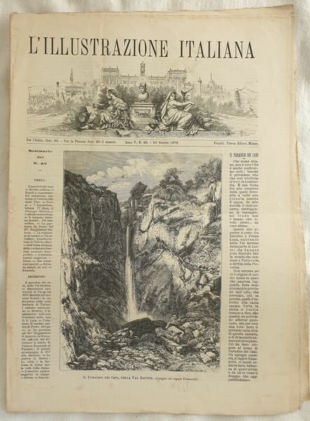 Numero del 20 ottobre 1878 dell'Illustrazione italiana. Il volume in folio è riccamente illustrato da incisioni nel testo e fuori testo. All'interno: Il paradiso dei cani nella Val Sassina, un ascensione notturna al Vesuvio, I calzolai marocchini, Dell'Italia al tempo della Rivoluzione francese, L'esercito austro ungarico in campo ecc. Le incisioni: Il paradiso dei cani nella Val Sassina, Modello del cannone Rosset in costruzione nella Reale Fonderia di Torino, Brescia esposizione dell'arte bresciana, Esposizione di Torino del 1878, La partenza del 40° reggimento di Fanteria da Roma, La guerra in Bosnia, L'esercito austro ungarico in campo ecc. In buone condizioni. Copertina editoriale in buone condizioni con lievi usure ai margini e dorso. Legatura editorialmente assente. Pagine in buone condizioni con fioriture. Piegatura orizzontale. In folio cm 38,5x28,5. Pp. da 241 a 256Number of 20th of october 1878 of Illustrazione italiana. The volume in folio is richly illustrated by engravings in the text and out of text. Inside: Paradise of dogs in Val Sassina, a night ascension to Vesuvio, I calzolai marocchini, Abvout Italy durinf french Revolution, Austrian ungaric army in field The prints: the paradise of dogs in Val Sassina, Model of Rosset is goign to be built in Reale Fonderia of Turin, Brescia exposition of Brescia art, Exposition of Turin of 1878, the leaving of 40° reggimento of Infantry from Rome, War in Bosnia, Austrian Hungaric army in field ecc. In good conditions. Editorial cover in good conditions slightly won in the extremities. Binding editoriarly lacks. Pages are in good conditions with foxing. Horizontal folding. In folio cm 38,5x27,5. Pp. from 241 to 256
