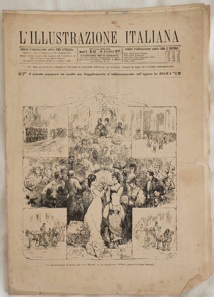 Numero del 15 dicembre 1878 dell'Illustrazione italiana. Il volume in folio è riccamente illustrato da incisioni nel testo e fuori testo. All'interno: Dall'Afganistan Petciaver ecc. Le incisioni: Dimostrazioni di Roma, i bambini delle scuole municipali presentano i loro auguri al Principino di Napoli, Livorno il varo del piroscafo Venezia, Le dimostrazioni di Napoli alle loro Maestà, La guerra nell'Afganistan ecc. In buone condizioni. Copertina editoriale in mediocri condizioni con usure ai margini e dorso. Legatura editorialmente assente. Pagine in buone condizioni con fioriture. Piegatura orizzontale. In folio cm 38,5x28,5. Pp. da 369 a 384MILANO - F.LLI TREVES EDITORI Number of 15th of december 1878 of Illustrazione italiana. The volume in folio is richly illustrated by engravings in the text and out of text. Inside: From Afganistan Petciaver The prints: Demonstrations of Rome, Demonstration of Naples, children in primary schools with their wishes to the Little Prince of Naples, Livorno and inauguration of piroscafo Venezia, War in Afganistan ecc. In good conditions. Editorial cover in poor conditions lightly won in the extremities. Binding editoriarly lacks. Pages are in good conditions with foxing. Horizontal folding. In folio cm 38,5x27,5. Pp. from 369 to 384