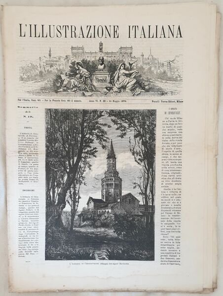 Numero del 11 maggio 1879 dell'Illustrazione italiana. Il volume in folio è riccamente illustrato da incisioni nel testo e fuori testo. All'interno: L'Abbazia di Chiaravalle, Il Centenario del Maestro Traetta, Le feste di Amsterdam,La Posta di Campo quadro di Fattori, Le feste di Amsterdam, Una visita alla Societa agricola dei trappisti delle tre fontane presso Roma Le incisioni: L'Abbazia di Chiaravalle, Il Maestro Traetta, Bitonto, La Posta di Campo quadro di Fattori, Il monumento a Vittorio Emanuele a Torino, Il Loggione quadro, Russia San Pietroburgo, Le feste di Amsterdam ecc. In buone condizioni. Copertina editoriale in buone condizioni con lievi usure ai margini e dorso. Legatura editorialmente assente. Pagine in buone condizioni con fioriture. Piegatura orizzontale. In folio cm 38,5x28,5. Pp. da 199 a 304Number of 11st of may 1879 of Illustrazione italiana. The volume in folio is richly illustrated by engravings in the text and out of text. Inside: The Abbey of Chiaravalle, Hundred years of Maestro Traetta, Feasts of Amsterdam,La Posta di Campo painting of Fattori, Feasts of Amsterdam, A visit to Societa agricola dei trappisti delle tre fontane near Roma The prints: Queen Vittoria in Baveno, Royal Palace of Caserta, Three fountains near Rome, Pietroburgo, Along the Coasts of Norway ecc. In good conditions. Editorial cover in good conditions lightly won in the extremities. Binding editoriarly lacks. Pages are in good conditions with foxing. Horizontal folding. In folio cm 38,5x27,5. Pp. from 199 to 304