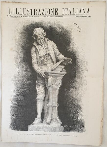 Numero del 9 novembre 1879 dell'Illustrazione italiana. Il volume in folio è riccamente illustrato da incisioni nel testo e fuori testo. All'interno: Il monumento a Galvani a Bologna, Il monumento pel traforo del Cenisio, Il nuovo carcere cellulare di Milano, La "Garibaldi" intorno al mondo" ecc. Le incisioni: La statua di Galvani, Il monumento pel traforo del Cenisio, Il nuovo carcere cellulare di Milano, La guerra dei zulu il Re Cettiwajo ecc. In buone condizioni. Copertina editoriale in buone condizioni con lievi usure ai margini e dorso. Legatura editorialmente assente. Pagine in buone condizioni con fioriture. Piegatura orizzontale. In folio cm 38,5x27,5. Pp. da 289 a 304Number of 9th of november 1879 of Illustrazione italiana. The volume in folio is richly illustrated by engravings in the text and out of text. Inside: the monument Galvani in Bologna, the monument of Cenisio, the new jail of Milan, The "Garibaldi" around the world. The prints: the monument Galvani in Bologna, the monument of Cenisio, the new Jail of Milan, La guerra deiThe war of zulu the King Cettiwajo ecc. In good conditions. Editorial cover in good conditions slightly won in the extremities. Binding editoriarly lacks. Pages are in good conditions with foxing. Horizontal folding. In folio cm 38x27,5. Pp. from 289 to 304