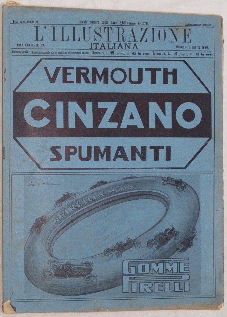 In folio. Dim. 40x30 cm. Pp. da 181 a 212. Numero del 15 agosto 1920 della nota rivista illustrata di attualità e cultura fondata a Milano nel 1873 da Treves. Redatta sul modello della rivista francese "L'Illustration", vi collaborarono numerose firme tra cui Verga, Carducci, Pascoli, D'Annunzio, Fogazzaro, Deledda ecc. All'interno diverse incisioni e foto tra cui gli avvenimenti in Polonia sul fronte Ucraino; il grande concorso nazionale per il "Monumento al fante" (con vari progetti); Buenos Aires: le solenni onoranze alla memoria del general Belgrano; il convegno alpino della società Pietro Micca di Biella; la compagnia frigorifera di Santos; Industria dello zucchero in Brasile ecc. Numerose pubblicità d'epoca (tra le quali diverse colorate). Brossura editoriale in buone condizioni generali con usure ai margini e dorso. Legatura in buone condizioni ma con qualche pagina staccata. All'interno le pagine si presentano in buone condizioni con rare fioriture. Number of the 15th of August 1920 of the famous illustrated of actuality established in Milan in 1873 by Treves. Redacted on the model of the french magazine "L'Illustration", different authors collaborated among them Verga, Carducci, Pascoli, D'Annunzio, Fogazzaro, Deledda etc. Different engravings and photoes inside among them the happenings in Poland in Ukraine front; the great national prize for the "Monument al fante" (with different projects); Buenos Aires: the honourings to the memories of the general Belgrano; the alpine meeting of the society Pietro Micca from Biella; the fridge company of Santos; Industry of sugar in Brasil etc. Different advertisings of that time inside. Editorial cover in good general conditions slightly worn in the edges and spine. Binding in good conditions wih some page detached. Inside pages are in good conditions with occasional foxings.