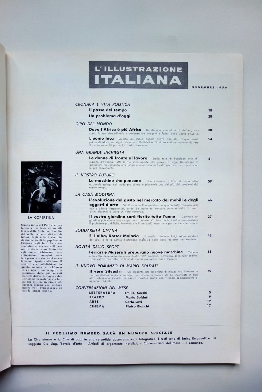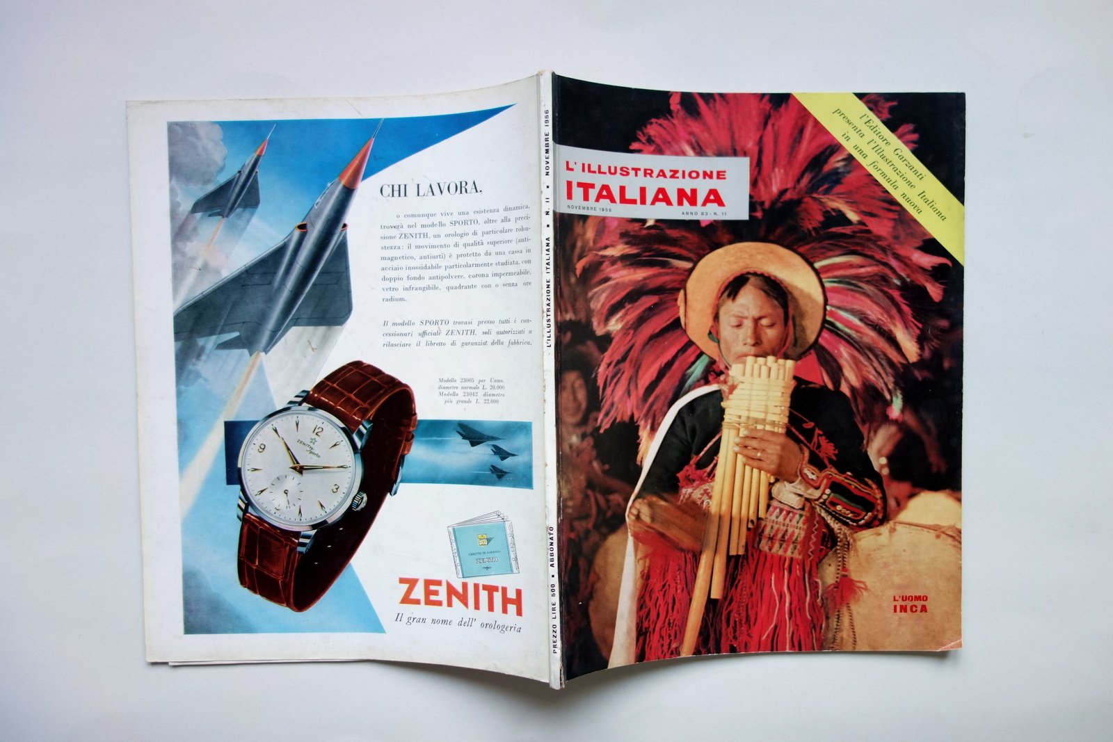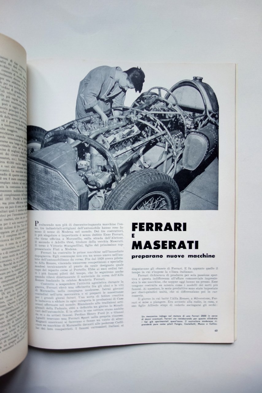 Rivista, Ferrari e Maserati preparano nuove macchine" in "L'Illustrazione Italiana" anno 83 - numero 11 novembre 1956 1956; cm 31x24,5; pp. 98 con ill. in b/n e a colori; brossura ed. ill. a colori. Numero completo. Condizioni di conservazione Esemplare in buone condizioni con tracce d'uso; angolo inf. della brossura ant. con una minima pieghetta, dorso con poche piccole abrasioni e un taglietto di un paio di cm alla cuffia inf. Interni buoni. L'articolo sopra indicato è di 3 pagine. Per maggiori informazioni vedi foto indice. Numero completo. RVS001N00711 "