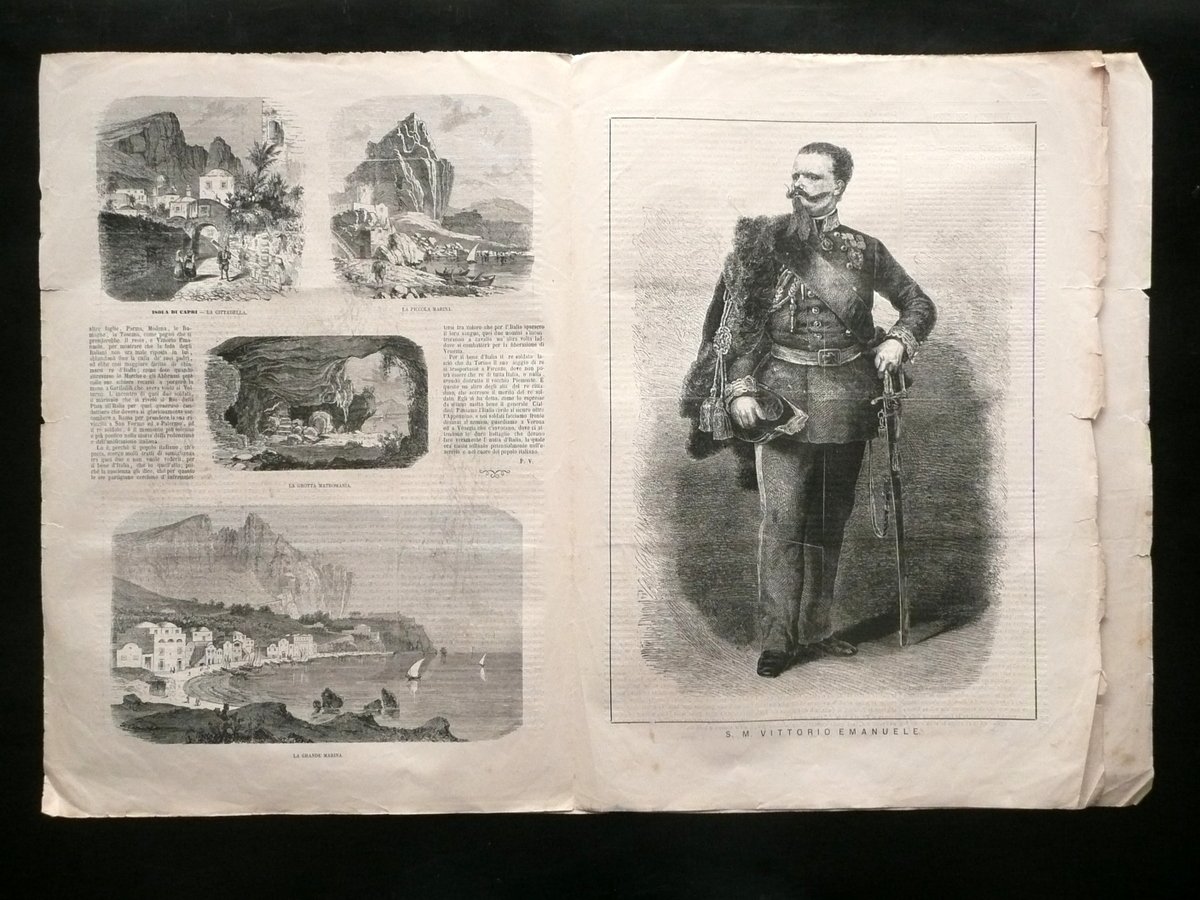 Settimanale, L'Illustrazione Universale" Anno I - Numero 51 18 Dicembre 1864 Sonzogno Editore, Milano 1864, cm 44x31,5, da pagina 409 a pagina 416 (esemplare autonomo con numerazione progressiva), con alcune belle ill. incise in b/n e f. t.; esemplare a fogli sciolti. Numero completo. Condizioni di conservazione Esemplare complessivamente ben conservato con tracce d'uso e qualche piccola lieve brunitura; margini e angoli con alcuni piccoli strappetti e pieghette; margine sup. dell'esemplare con una leggera gora di vecchia umidità che non coinvolge il testo o le illustrazioni (vedi foto); dorso con qualche piccolo strappetto e con uno strappo di alcuni cm alla parte inf. (vedi foto). Presenza di quattro belle illustrazioni incise in bianco e nero dell'isola di Capri, e di una grande illustrazione incisa in bianco e nero a piena pagina del Re Vittorio Emanuele II (vedi foto). Numero completo. SC03.D10550 N F "