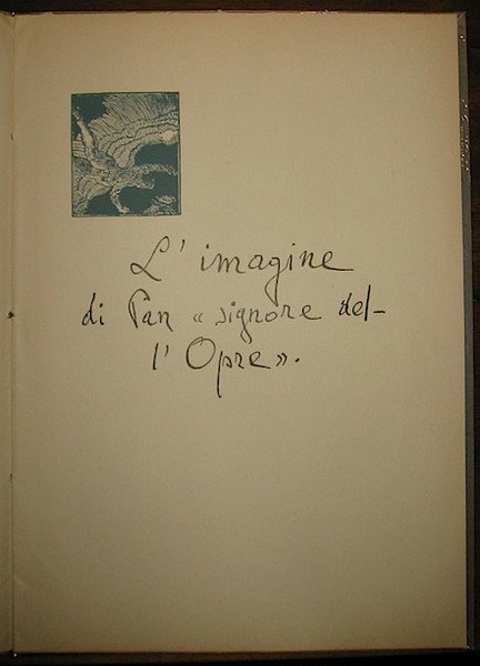 4to (cm. 35,5), 1 c.nn. bianca, 5 cc. in facsimile d’autografo datato 14 giugno 1936 su carta con l’impresa raffigurante un uomo alato in azzurro, 2 cc.nn. Copertina in cartoncino azzurro con titolo in blu entro triplice riquadro, cordoncino azzurro. Margini delle copp. leggermente sbiaditi, altrimenti ottimo esemplare. Il messaggio è diretto ai componenti dell’Istituto del Nastro Azzurro. Vecchioni, 95.