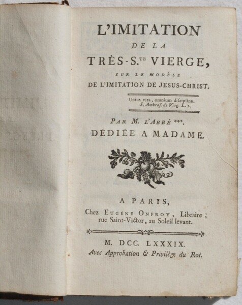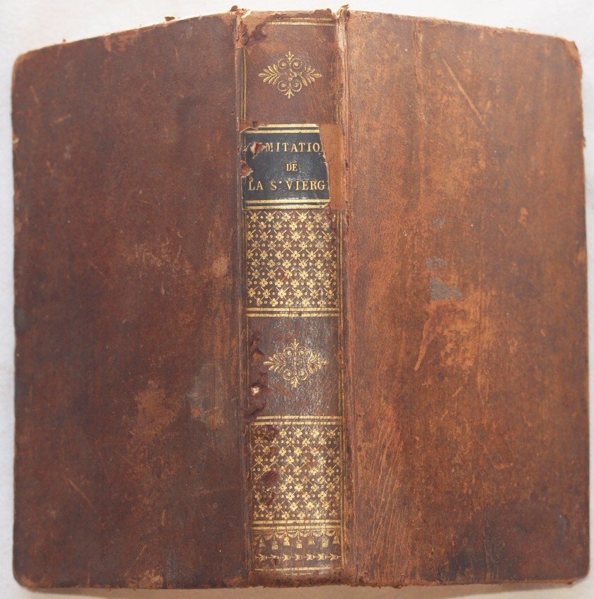 In 16. Dim. 17,5x10,5 cm. Pp. XL+440. Bella edizione del 1789 di questa interessante opera di culto mariano scritta da un anonimo. Di tratta dell'"Imitazione della Santissima Vergine" opera scritta su modello dell'"Imitazione di Gesù Cristo". Nella prima parte dell'opera l'autore descrive la vita e virtù della Madonna, dall'Immacolata Concezione sino alla nascita del suo divino figlio a Betlemme. Nella seconda parte vita e virtù della Madonna dalla nascita di Gesù Cristo fino al calvario. Nella terza parte fino all'assunzione, nella quarta e ultima si parla del sentimento di rispetto, stima, zelo, amore tenerezza per la Santa Vergine. Alla prima carta bianca manoscritto in francese datato 1829. Bella legatura in piena pelle con ricche decorazioni al dorso. In buone condizioni. Copertina in piena pelle con titolo e decorazioni in oro al dorso in buone condizioni generali con lievi usure ai margini e dorso. Legatura in buone condizioni ma rottura alla prima pagina di sguardia. All'interno le pagine si presentano in ottime condizioni con rare fioriture. Lieve gora d'umidità al margine destro delle prime XXVI pagine. Prima pagina di sguardia in parte staccata. Beautiufl edition of 1789 of this interesting work of marian cult written by an anonymous author. It is about the"imitation of the very holy Virgin" written on the model of the "Imitation of Jesus Christ". In the first part the aiuthor describes life and virtues of the Madonna, from the Immaculate Conception until the bearing of her divine son in Bethlem. In the second part life and virtues of the Madonna from the bearing of Jesus Christ until the Calvary. In the third part until the Assumption, in the fourth and last part of the feeling of respect, estimation, love for the holy Virgin. In the first white page manuscript in french language dated 1829. Beautiufl full leather cover with golden title and decorations in the spine. In good conditions. Full leather cover with golden title and decorations in the spine in good general conditions slightly worn in the edges and spine. Binding in good conditions with a crack in the first endpaper. Inside pages are in very good conditions with occasional foxings. Slight humidity stain in the right edge fo the first XXVI pages. First endpaper is partially detached.