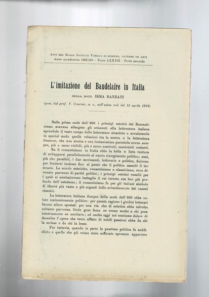 L'imitazione del Baudelaire in Italia. Estratto dagli Atti del Reale Istituto Veneto di scienze lettere e arti del 1922-1923.