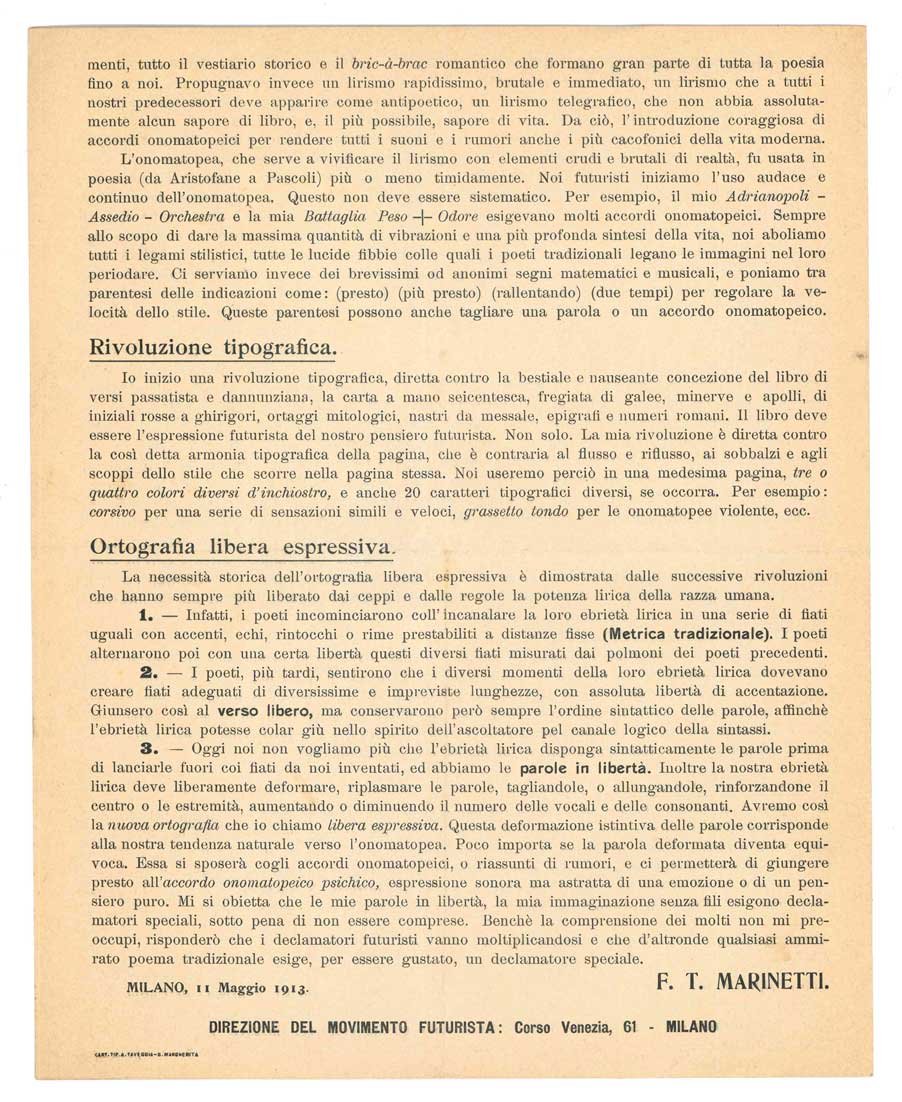 MANIFESTOEdizione originale.Ottimo esemplare (minimi segni del tempo sul bordo esterno dei fogli).Uno dei manifesti letterari fondamentali di Marinetti, caposaldo teorico del paroliberismo. Ultimato senz’altro nel maggio del 1913, è inviato per lettera da Carrà a Soffici con data 20 maggio 1913, e detto «non ancora distribuito ad alcuno» (Archivi del futurismo 1958, p. 267-8).Cammarota, Futurismo, Manifesti, 20; Tonini, I manifesti, 58.1