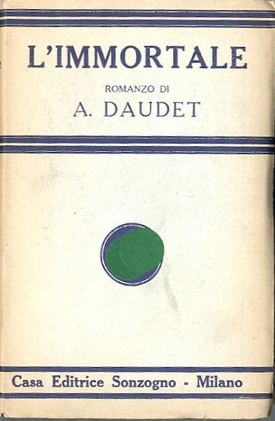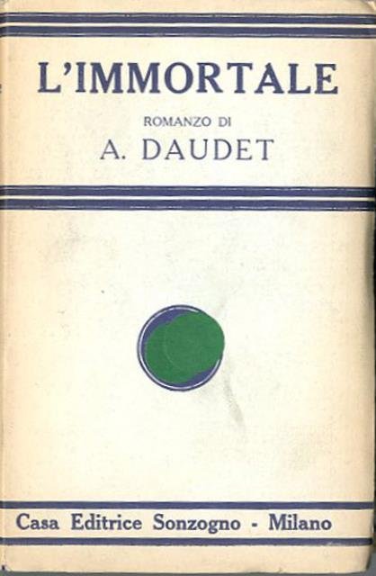 Rist. stereotipa. 250 p. ; 18 x 11 cm. I grandi autori. Daudet esordì con un libro di versi, "Les Amoureuses" (1858), fu giornalista e, per cinque anni, segretario del duca di Morny. Raccolse le impressioni dei suoi primi anni in "Le petit Chose, histoire d'un enfant" (1868); si affermò poi con i racconti "Lettres de mon moulin" (1869) come descrittore delicato della sua Provenza, non risparmiando poi una bonaria satira al carattere dei suoi abitanti con le "Aventures prodigieuses de Tartarin de Tarascon" (1872), proseguite con "Tartarin sur les Alpes" (1885) e "Port-Tarascon" (1890). Affrontò anche il romanzo di costume: "Fromont jeune et Risler l'aîné" (1874); "Jack" (2 voll., 1876); "Le nabab" (1877); "Les rois en exil" (1879); "Numa Roumestan" (1881); "L'évangéliste" (1883); "Sapho" (1884), da molti considerato il suo capolavoro; e infine "L'immortel" (1888), satira contro l'Accademia francese, raccolte di racconti, ecc. Il romanzo di costume lo accostò alla scuola naturalistica, che peraltro non attenuò la sua vena di scrittore umano e cordiale. Tentò anche il teatro, ma ebbe fortuna solo "L'Arlésienne" (1872) cui G. Bizet diede felici musiche di scena. Sul front.: Prima traduzione italiana autorizzata. Titolo originale dell'opera: "L'immortel". . Legatura editoriale, coperta in cartone semirigido di tela blu plastificata con impresso il titolo in nero al piatto e al dorso, sovraccoperta in carta colorata con alette. Qualche leggero segno del tempo alla sovraccoperta, modesto ingiallimento delle pagine interne per il resto libro in ottimo stato. Codice libreria 3829.