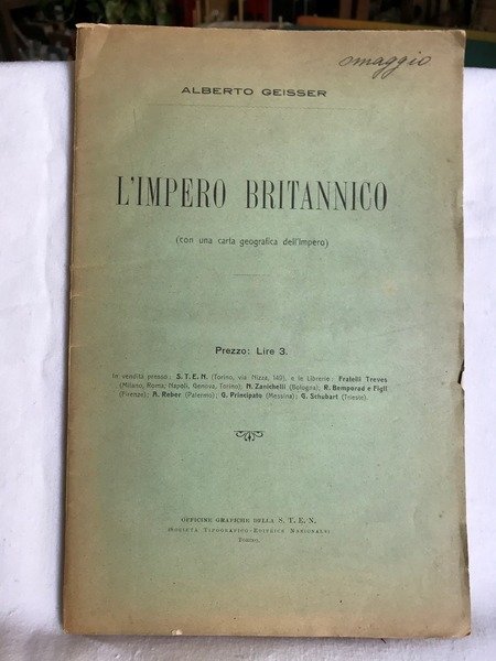 Fascicolo in 8, brossura editoriale, titolo al piatto, frontespizio, dedicatoria, sommario, 68 pp., 1 tav. ripiegata f.t. con Planisfero a colori. Interessante trattatello con particolare rilevanza alla storia delle maggiori Colonie inglesi: quelle Nord Americane 'Nuova Inghilterra' e Canada, l'Australia, l'Unione del Sud Africa e l'India ma anche considerazioni sulla Giustizia, sull'educazione e sulle qualit fondamentali degli anglosassoni. In buono stato.
