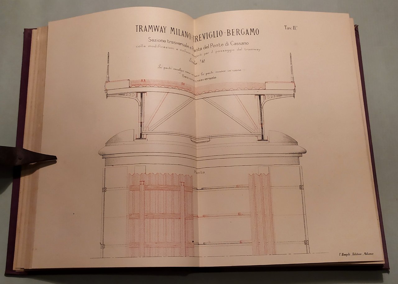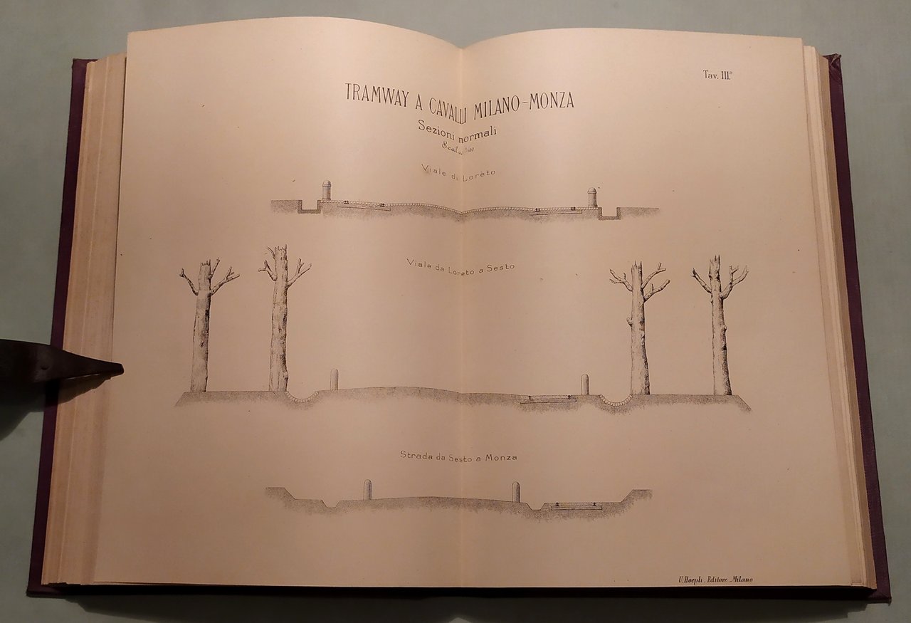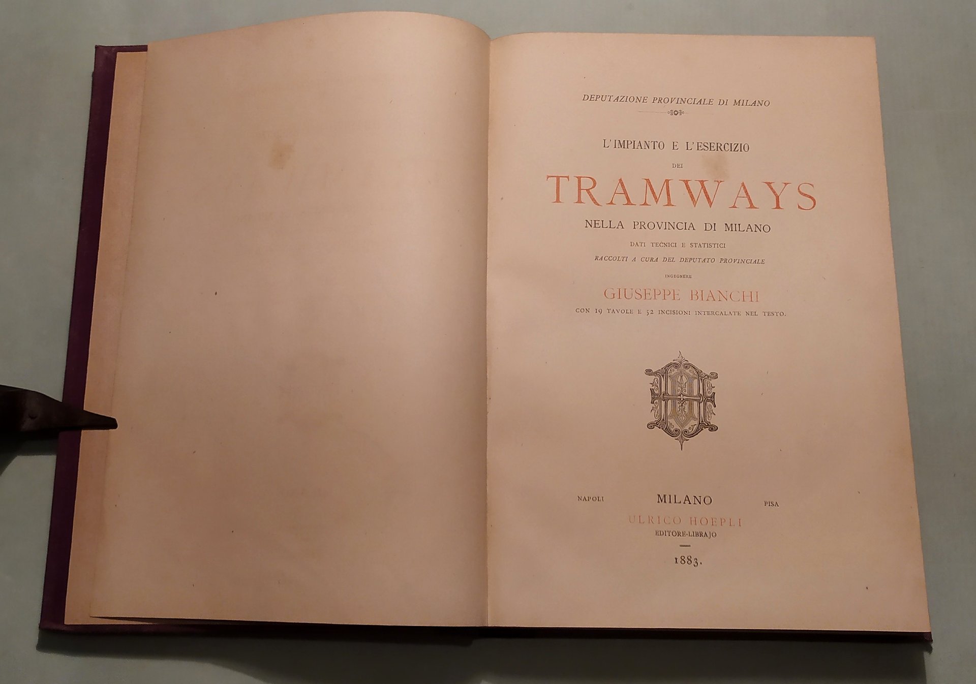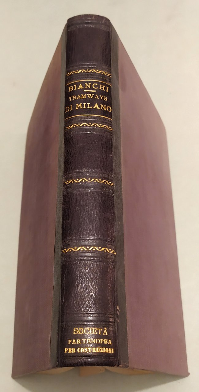 BIANCHI Giuseppe. L'impianto e l'esercizio dei tramways nella provincia di Milano. Dati tecnici e statistici raccolti a cura del deputato provinciale Ingegnere Giuseppe Bianchi. Con 19 tavole e 52 incisioni intercalate nel testo. Milano, Hoepli, 1883. In 8vo; pp.VIII,5n.nn.,270. Frontespizio a caratteri neri e rossi. Mezza tela coeva, titolo e fregi in oro al dorso. Legatura al nome: Società Partenopea per Costruzioni. Bibliografia Ferroviaria Italiana,188313500.