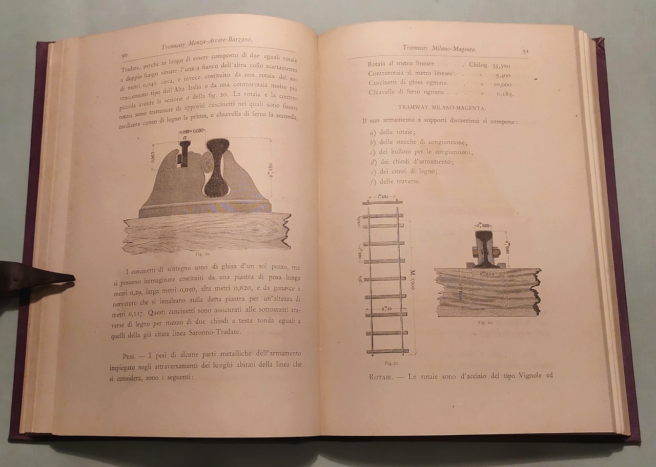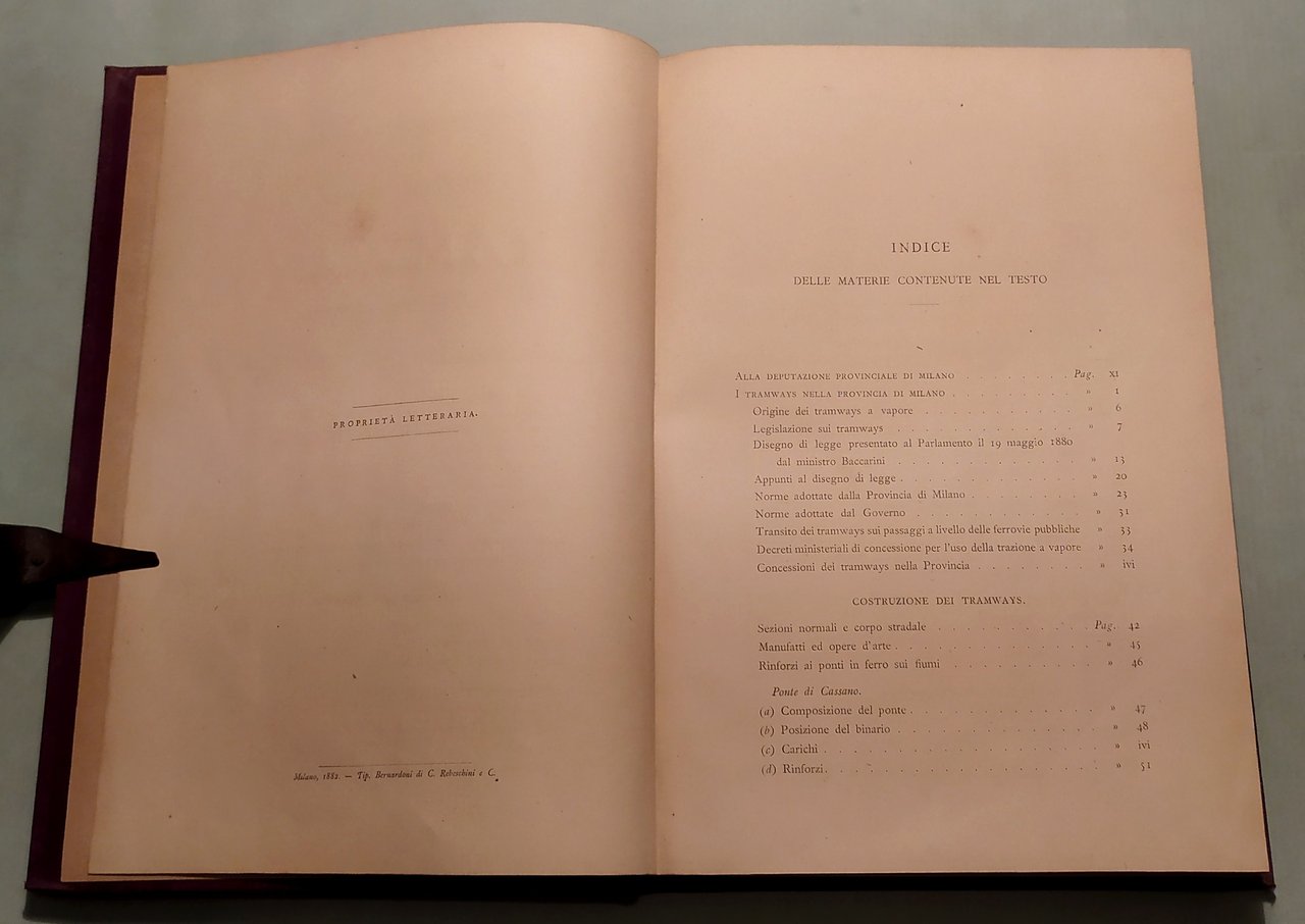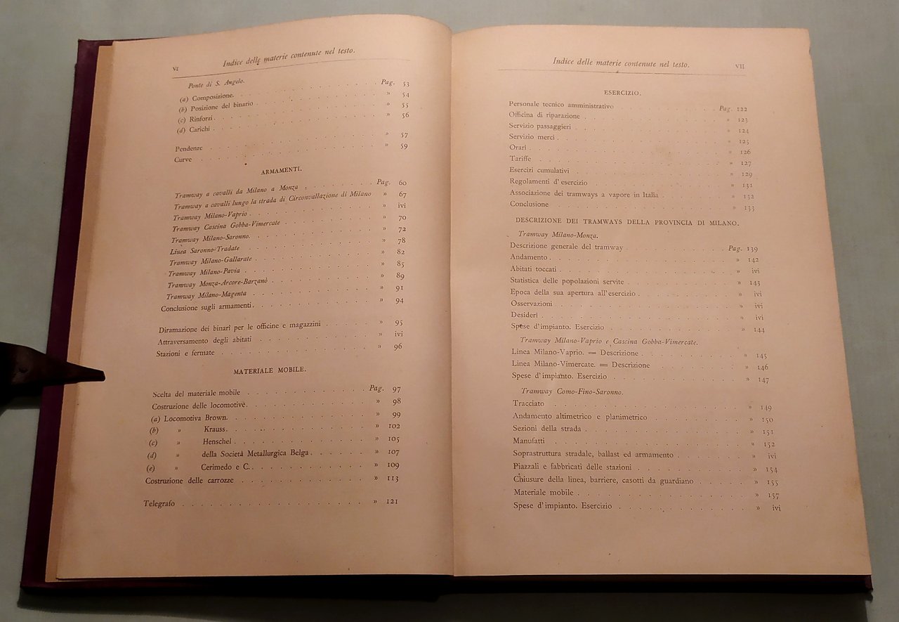 BIANCHI Giuseppe. L'impianto e l'esercizio dei tramways nella provincia di Milano. Dati tecnici e statistici raccolti a cura del deputato provinciale Ingegnere Giuseppe Bianchi. Con 19 tavole e 52 incisioni intercalate nel testo. Milano, Hoepli, 1883. In 8vo; pp.VIII,5n.nn.,270. Frontespizio a caratteri neri e rossi. Mezza tela coeva, titolo e fregi in oro al dorso. Legatura al nome: Società Partenopea per Costruzioni. Bibliografia Ferroviaria Italiana,188313500.