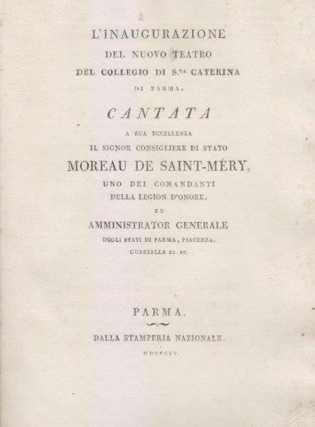 L'inaugurazione del nuovo Teatro del Collegio di S.ta Caterina di Parma. Cantata a sua eccellenza il signor consigliere di stato Moreau de Saint-Méry, uno dei comandanti della legion d'onore, ed amministrator generale degli stati di Parma, Piacenza, Guastalla ec. ec