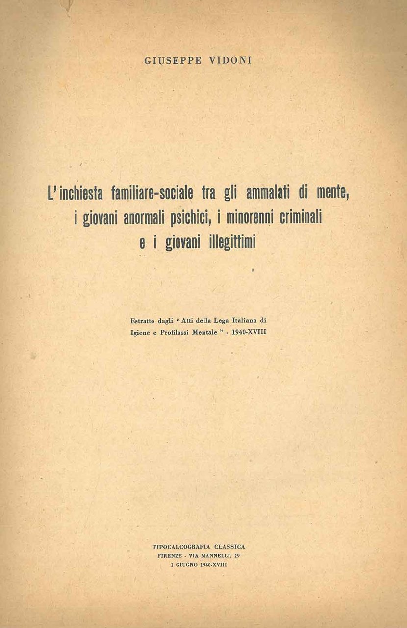 L' inchiesta familiare-sociale tra gli ammalati di mente, i giovani anormali psichici, i minorenni criminali e i giovani illegittimi. Estratto dagli "Atti della Lega Italiana di Igiene e Profilassi Mentale" 1940