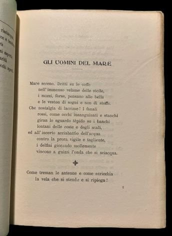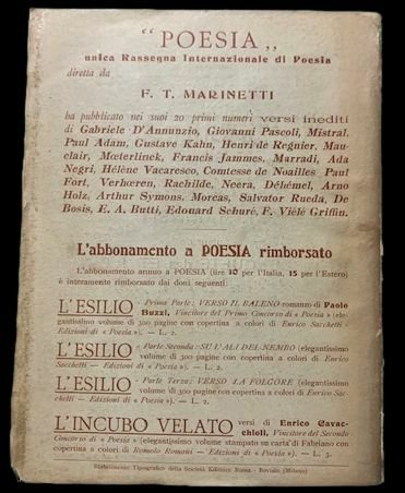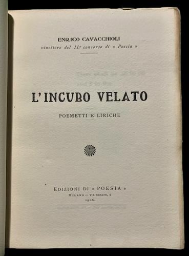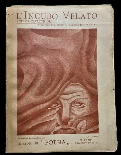 In 8° (18,8×14 cm); (9), 12-154, (6 con indice del catalogo editoriale) pp. Brossura editoriale illustrata con immagine in sanguigna al piatto anteriore opera di Romolo Romani. Una piccolissima integrazione di carta al margine alto bianco del dorso, ininfluente e nel complesso esemplare in buone-ottime condizioni di conservazione, allinterno con carte bianche e forti ed ancora in barbe. Prima edizione della seconda opera del celebre commediografo, giornalista e poeta futurista siciliano, Enrico Cavacchioli (Pozzallo in provincia di Ragusa, 15 marzo 1885 Milano, 4 gennaio 1954). Dichiarazione fittizia, come tipica della produzione futurista, di 2° migliaio, in realtà prima ed unica edizione Cavacchioli si formò a Milano. Inizialmente influenzato dalla poetica dannunziana (che in parte non abbandonò mai), passò ben presto a quella crepuscolare. Tra i firmatari del manifesto del movimento futurista pubblicato a Parigi nel 1909, la sua produzione poetica e letteraria si prefiggeva di analizzare le tematiche della vita borghese ma trascurando gli aspetti banali e superficiali dellesistenza umana, si concentrò sullelemento irrazionale, illusorio, bizzarro, simbolista e assurdo della cronaca quotidiana. Nel secondo manifesto futurista Uccidiamo il chiaro di luna! il suo nome compare fra i poeti incendiari e prese parte, anche, alle tumultuose serate futuriste partecipando alle risse e tafferugli con le quali solitamente, di concludevano. Fu presente anche durante il rpocesso per oltraggio al pudore contro il romanzo marinettiano di Mafarka il futurista. Autore di romanzi, simbolisti e grotteschi dal sapore dannunziano, come Vamp del 1920 e Serenata celeste del 1932, è nella commedie come La campana dargento (del 1913), Luccello del Paradiso (1919) che la sua verve creativa e assurda si sviluppa ai massimi livelli. Con la raccolta di poesie qui presentata, Cavacchioli vinse la seconda edizione del premio di poesia, ideato da Marinetti. Scrive di lui Stefano Giornetti, nella voce dedicata a Cavacchioli nel Dizionario Biografico degli Italiano, Volume 22 (1979): Nato a Pozzallo (Ragusa), da Vincenzo e da Silvia Federici il 15 marzo 1885, giovanissimo si stabilì a Milano, prendendo parte attiva alla vita culturale come giornalista e poeta. Le sue prime esperienze poetiche echeggiarono i modi dannunziani allora in voga, per passare in un secondo tempo a toni crepuscolari. Aderì subito al movimento futurista, attirato soprattutto dal potenziale di concreta rivolta contro la tradizione e laccademia, e fu uno dei militanti più in vista di questa corrente davanguardia, con una prepotente immediatezza di sentimenti e un fascino quasi barbaro, pure muovendosi per certi aspetti ancora nel solco della tradizione. Opera non comune da reperirsi completa della brossura editoriale (piatti e dorso). Rif. Bibl.: Salaris, p. 24.
