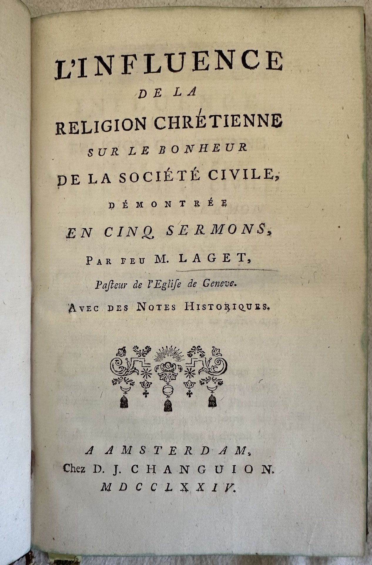 Rarissima pubblicazione del 1774 sull'influenza della religione cristiana sul benessere della società civile scritta da Laget. Note storiche. In buone condizioni. Copertina in piena pelle coeva con titolo in oro al dorso con usure marginali, Piatto posteriore staccato. Legatura in buone condizioni. All'interno le pagine si presentano in buone condizioni con rare fioriture. In 8. Dim. 19,5x12,5 cm. Pp. (2)+126+(2). Very scarce of 1774 about the influence of christian religion on the good health of civil society written by Laget. Historical notes. In good conditions. Full leather coeval cover with gilted title in the spine lightly worn in the edges, back plate detached. Binding in good conditions. Pages in good conditions with occasional foxing. In 8. Dim. 19,5x12,5 cm. Pp. (2)+126+(2).