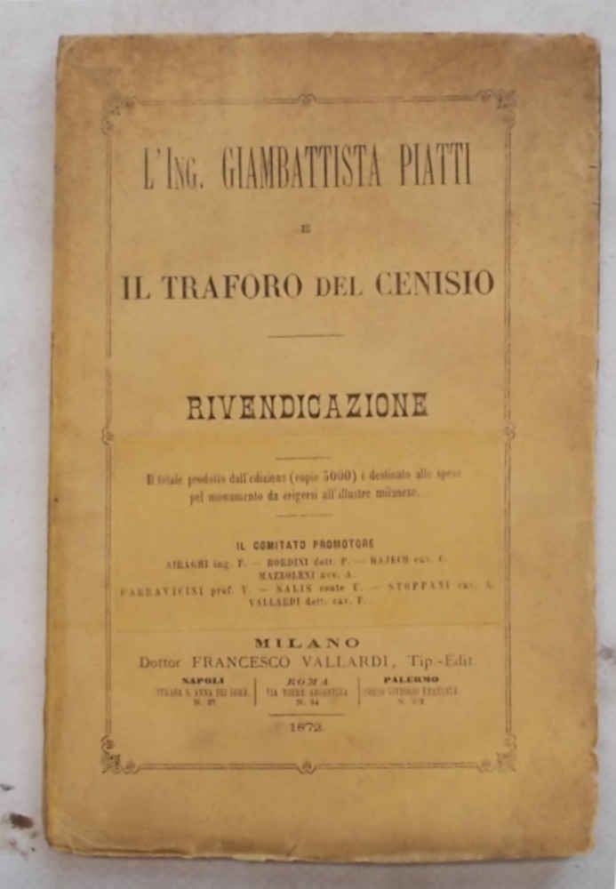 In 16° (cm. 19 x 12); pagg. (4), 115, (7); brossura origin. con cornice tipograf.; in parte intonso. VG. ** "Il merito del traforo del Frejus spetta a G.B. Piatti, a nessun altro fuori di lui. perchè è l'unico e vero inventore della macchina perforatrice ad aria compressa e di tutto il sistema."