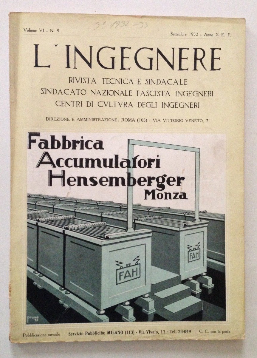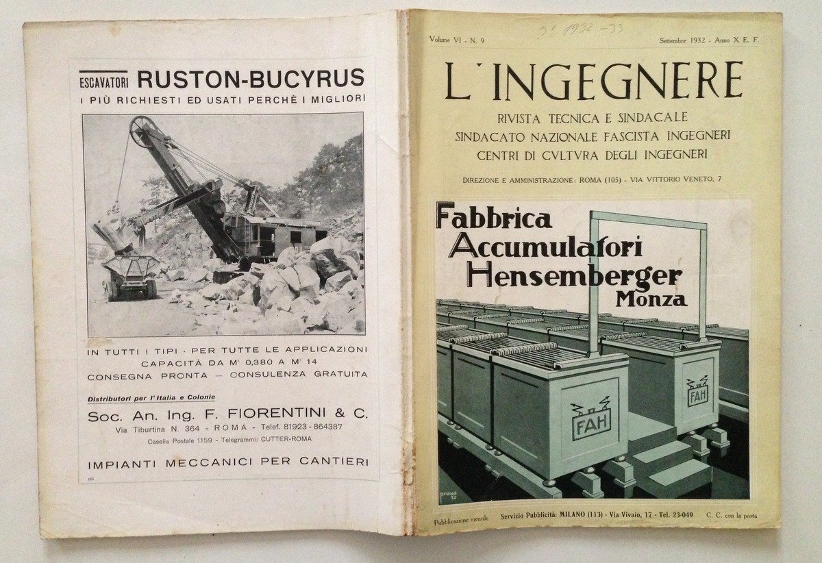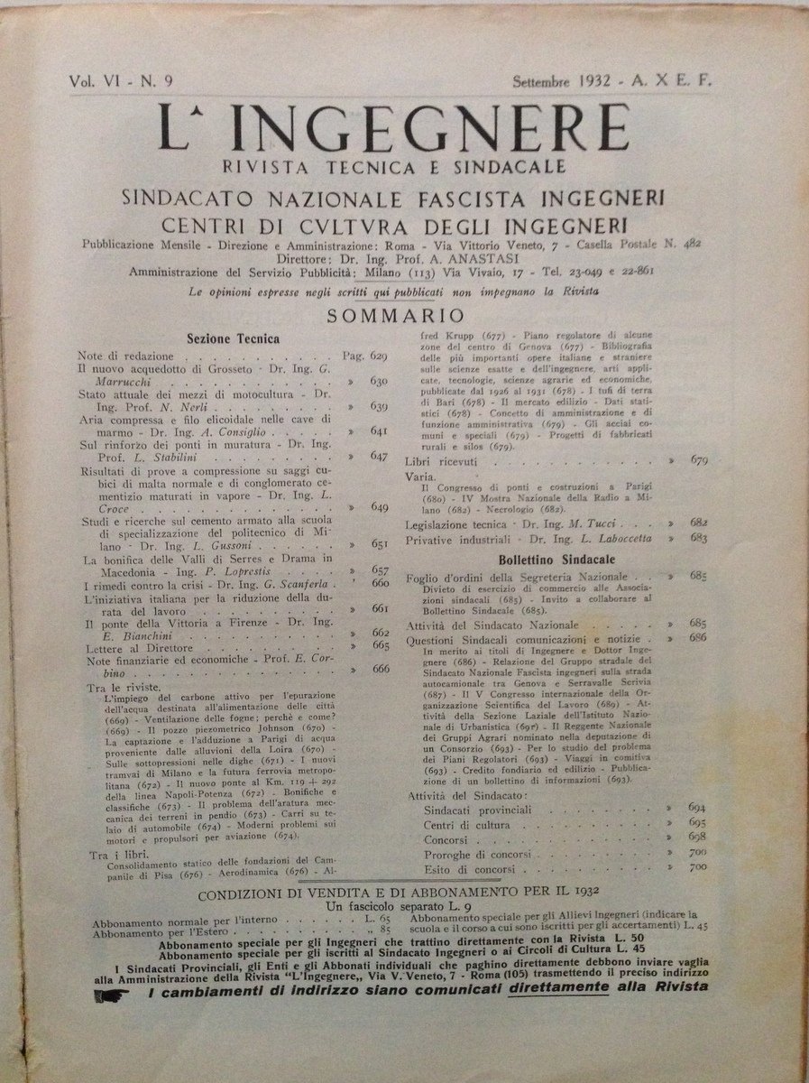 Mensile, Rivista L'Ingegnere" N. 9, settembre 1932 All'interno articolo di: Marrucchi :"Il Nuovo Acquedotto di Grosseto" (9 pagine con 19 ill. fot. e disegni) Rivista Tecnica e Sindacale "L'Ingegnere" 1932, cm 31x22.5, pp. LXVIII (inserzioni pubblicitarie) , da 631 a 700 testo con numerose ill. in b/n nel. t.; all'interno articolo dell'ingegnere Marrucchi "Il Nuovo Acquedotto di Grosseto" di 9 pagine con 19 ill. fot. e disegni; brossura ed. ill. a colori. Numero completo. Condizioni di conservazione Esemplare in buone condizioni con tracce d'uso; brossura editoriale con leggere abrasioni; dorso con qualche mancanza alla cuffia inferiore; interni buoni. Numero completo. RVS001N00047 "