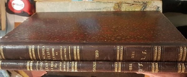 Due volumi di cm. 31. Il primo di testo di PAGINE 496 con 731 figure incise; il secondo con 50 grandi tavole fuori testo anche a colori e ripiegate. Indice degli argomenti: L'ingresso principale, I capitelli degli edifici principali dell'esposizione considerati nei loro motivi di ornamentazione, I generatori del vapore in servizio dell'Esposizione, Il piano generale dell'Esposizione, Gli ingressi secondari dell'Esposizione, Il Tempio di Vesta, Esposizione d'Architettura, Le Gallerie principali dell'Esposizione, Elevazione d'acqua del Consorzio irriguo di Cigliano, ecc.La rivista fu compilata dal Sacheri con un'?quipe di collaboratori: Bonelli, Bottiglia, Caselli, Cerriana, Fadda, Ferrante, Fettarappa, Frizzi, Galassini, Gelati, Mazzanti, Pastore, Penati, Verole, Zecchini. Il Sacheri (Acqui Terme, 1843-Torino, 1925), ingegnere, fu professore di Disegno e assistente di Idraulica alla Scuola per Architetti ed Ingegneri di Torino, nonch? professore di Disegno lineare, geometrico, meccanico e poi di Geometria applicata all'Accademia Albertina della stessa citt?. Autore di numerosi scritti sull'ingegneria civile e industriale e sulla didattica dell'architettura, coordin?, insieme con Raffaele Pareto, l'Enciclopedia delle Arti ed Industrie (1878) e diresse la rivista "L'ingegneria civile e le arti industriali", dalla sua fondazione, nel 1875, fino al 1906. Italiano