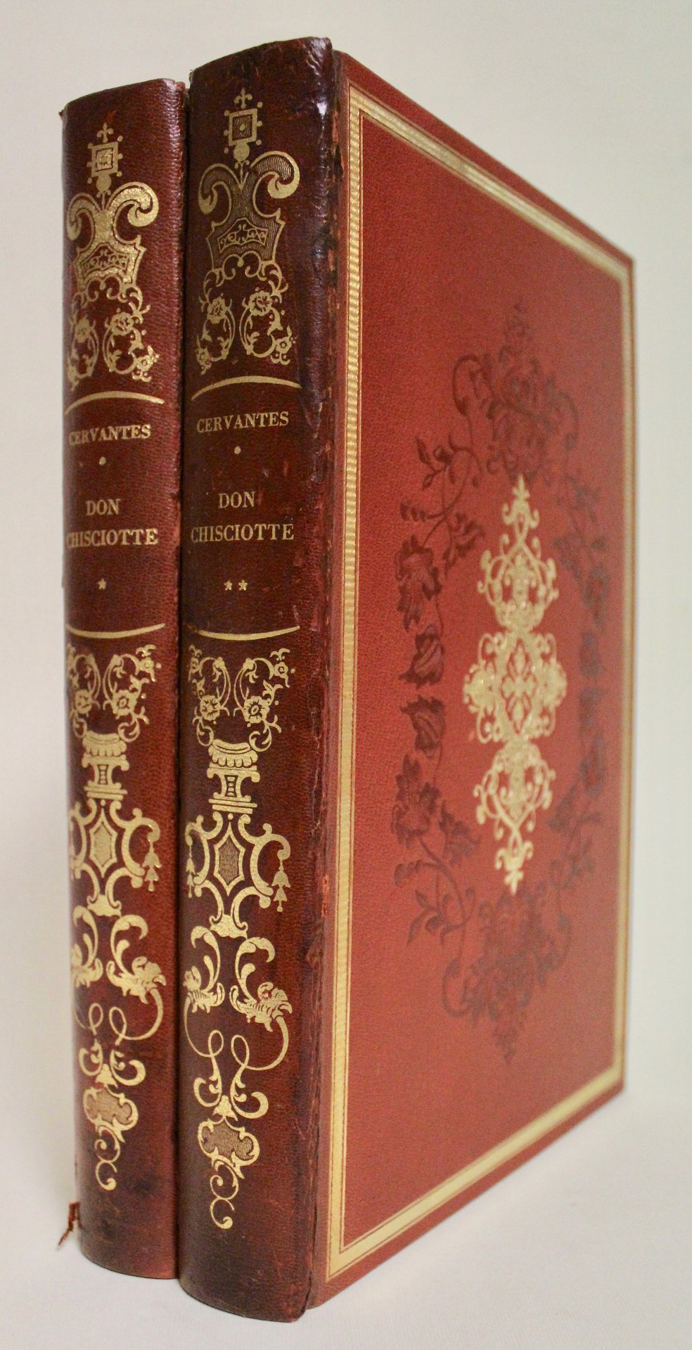2 voll. in 8° (mm 280x180). Pagg. VIII, 583, (2); 650, (3). 845 illustrazioni in b.n. n.t. Testo incorniciato da doppia cornice silografica. Elegante legatura editoriale in piena pelle con ricchi fregi a secco ed oro con losanga dorata entro fleuron a secco al centro dei piatti, titolo e ricchi decori in oro ai dorsi, tagli in oro, dentelle con losanghe dorate. Lavoro eseguito artigianalmente a mano dal legatore Giovanni De Stefanis in pelle di capra Madras conciata al vegetale con impressioni in oro zecchino. Custodia di conservazione in cartone muto.<BR>Ottimo stato. Esemplare della tiratura numerata di 1001 esemplari ad personam contraddistinti dalle lettere A. D. M. (n° 515). Fedele ristampa anastatica eseguita su clichés di zinco dell'edizione dell'Ubicini di Milano del 1841 della traduzione di Bartolomeo Gamba (qui riveduta dall'Ambrosoli) del sommo capolavoro della letteratura spagnola, nonché tra i capilavori della letteratura universale. La versione del Gamba, di squisita patina arcaicizzante e di classica nobiltà, è fra le più belle realizzate in lingua italiana; essa era stata edita per la prima volta a Venezia nel 1818-'19 ed era stata eseguita sul testo della Reale Accademia di Madrid del 1780. Le illustrazioni sono basate su quelle di alcune stimate edizioni precedenti (Madrid, Ibarra, 1780; Paris, Huart, 1733; Paris, David Fills Damonneville, 1741; Paris, Didot, 1799). Il Gamba (Bassano del Grappa, 1766-Venezia, 1841) fu direttore della veneziana Tipografia di Alvisopoli, bibliografo, bibliofilo, traduttore e socio della Crusca. <BR>Il capolavoro di Cervantes nella traduzione ottocentesca di Bartolomeo Gamba. Riveduto da Francesco Ambrosini. Edizione curata da Ernesto Gerbi, eseguita su carta India di fabbricazione speciale della Cartiera Ventura. Ottimo esemplare, solo minime spellature alle cerniere anteriori. <BR>