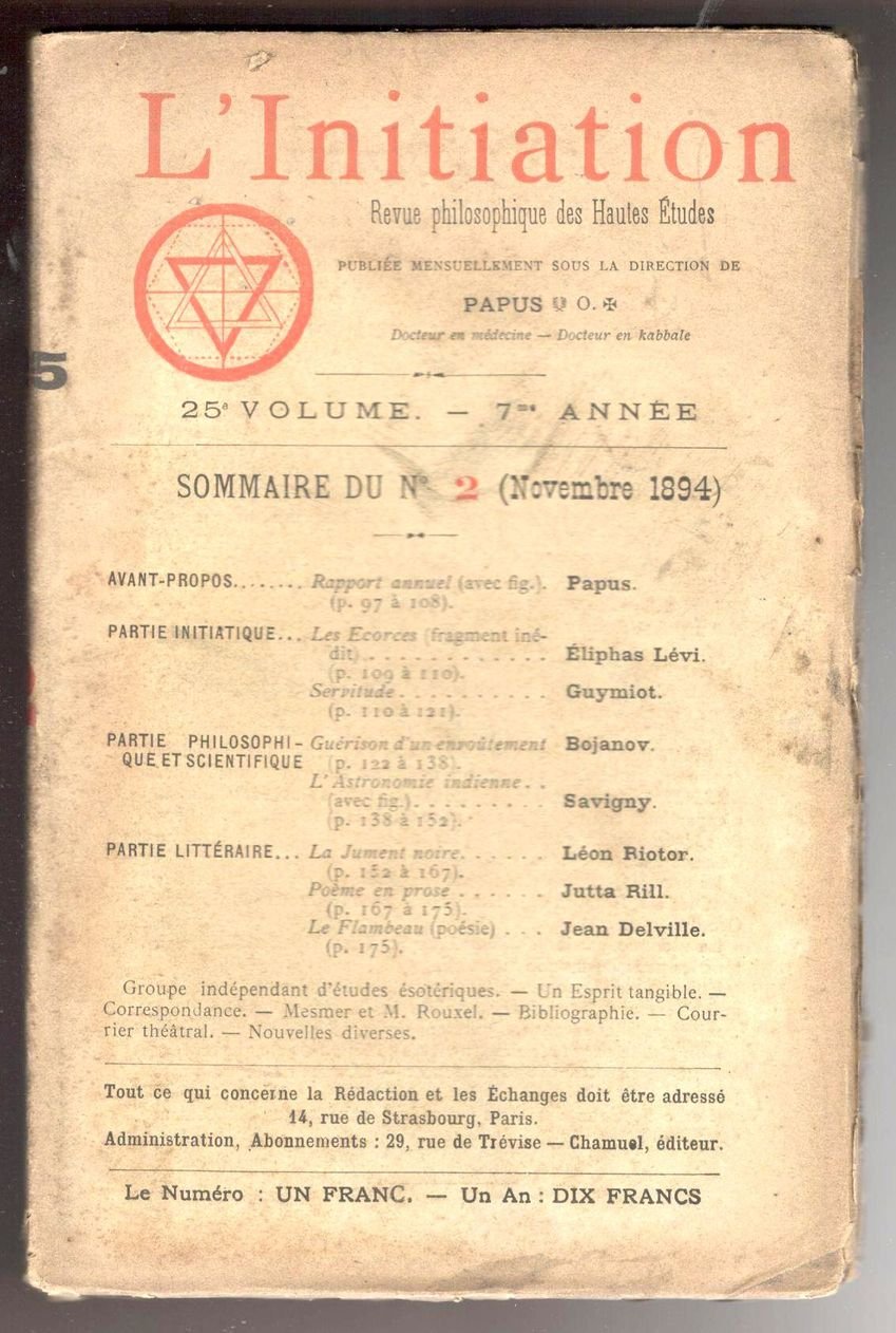 L'Initiation. Revue philosophique des Hautes Études. Publiée mensuellement sous la direction de Papus. 25e volume. 7me année. N. 2 (Novembre 1894)