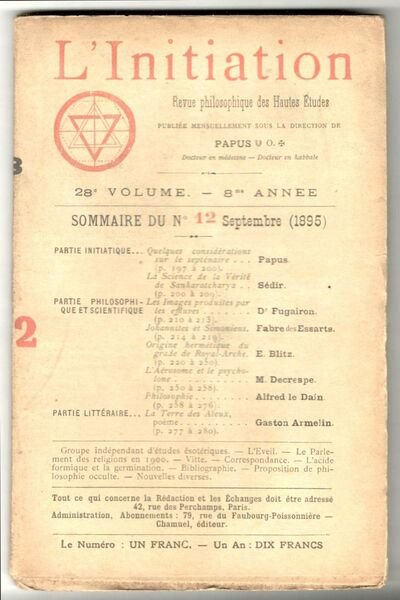 L'Initiation. Revue philosophique des Hautes Études. Publiée mensuellement sous la direction de Papus. 28e volume. 8me année. N. 12 Septembre (1895)