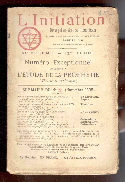 L'Initiation. Revue philosophique des Hautes Études. Publiée mensuellement sous la direction de Papus. 41e volume. 12me année. N. 2 (Novembre 1898). Numéro exceptionnel consacré à l'étude de la Prophétie (Théorie et application)