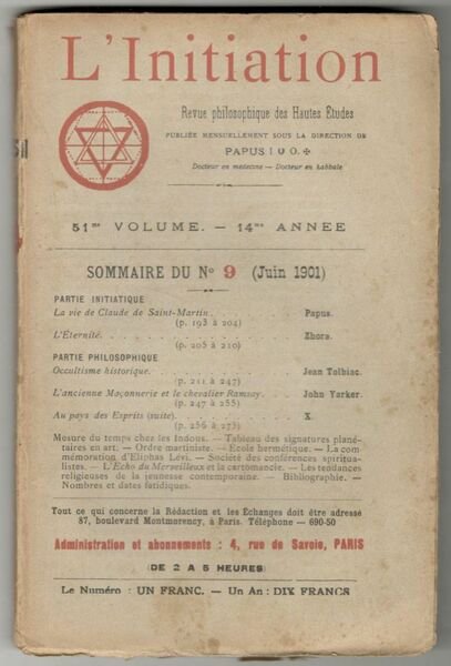 L'Initiation. Revue philosophique des Hautes Études. Publiée mensuellement sous la direction de Papus. 51me volume. 14me année. N. 9 (Juin 1901)