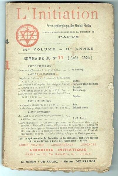 L'Initiation. Revue philosophique des Hautes Études. Publiée mensuellement sous la direction de Papus. 64me volume. 17me année. N. 11 (Aoüt 1904)