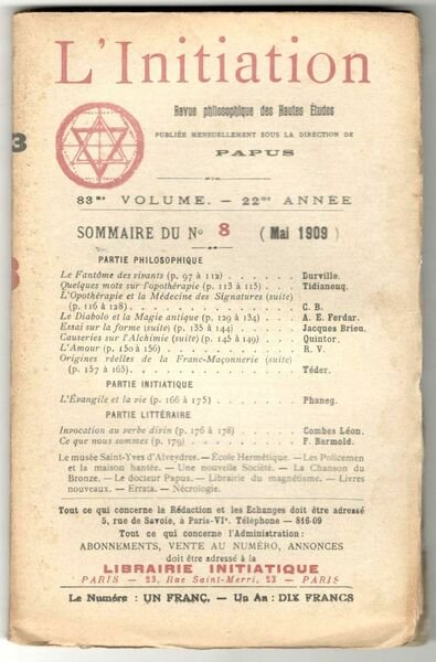 L'Initiation. Revue philosophique des Hautes Études. Publiée mensuellement sous la direction de Papus. 83me volume. 22me année. N. 8 (Mai 1909)