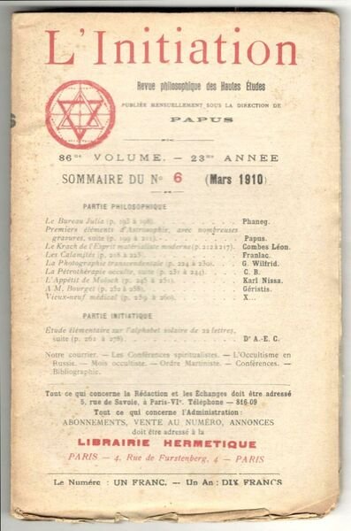 L'Initiation. Revue philosophique des Hautes Études. Publiée mensuellement sous la direction de Papus. 86me volume. 23me année. N. 6 (Mars 1910)