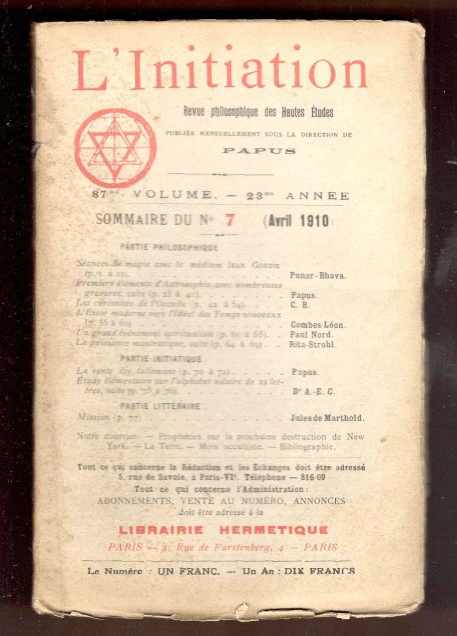 L'Initiation. Revue philosophique des Hautes Études. Publiée mensuellement sous la direction de Papus. 87me volume. 23me année. N. 7 (Avril 1910)
