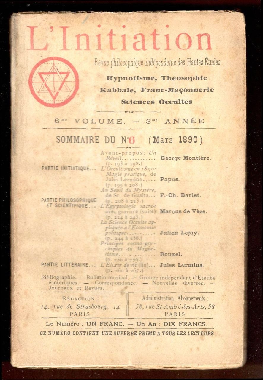 L'Initiation. Revue philosophique indépendante des Hautes Etudes. Hypnotisme, Théosophie, Kabbale, Franc-Maçonnerie, Sciences occultes. 6e volume. 3me année. N. 6 (Mars 1890)