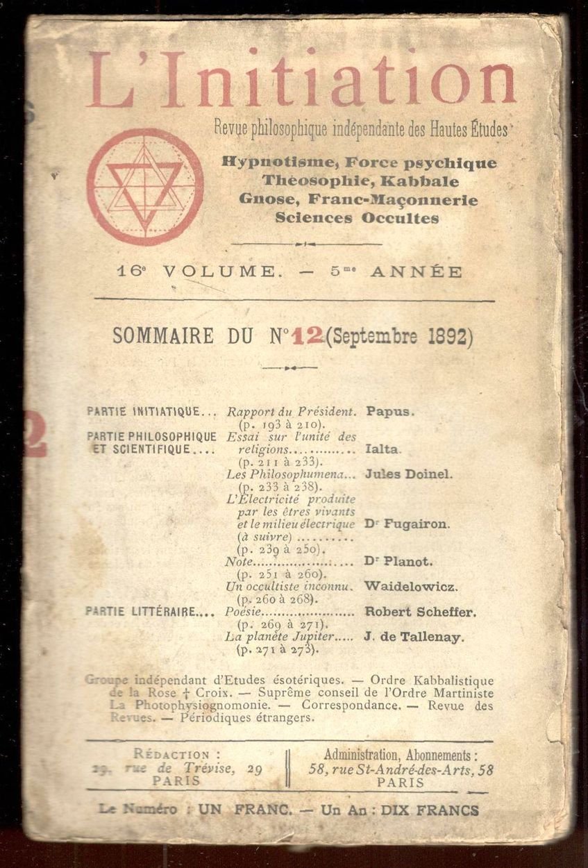 L'Initiation. Revue philosophique indépendante des Hautes Etudes. Hypnotisme, Théosophie, Kabbale, Franc-Maçonnerie, Sciences occultes. 16e volume. 5e année. N. 12 (septembre 1892)