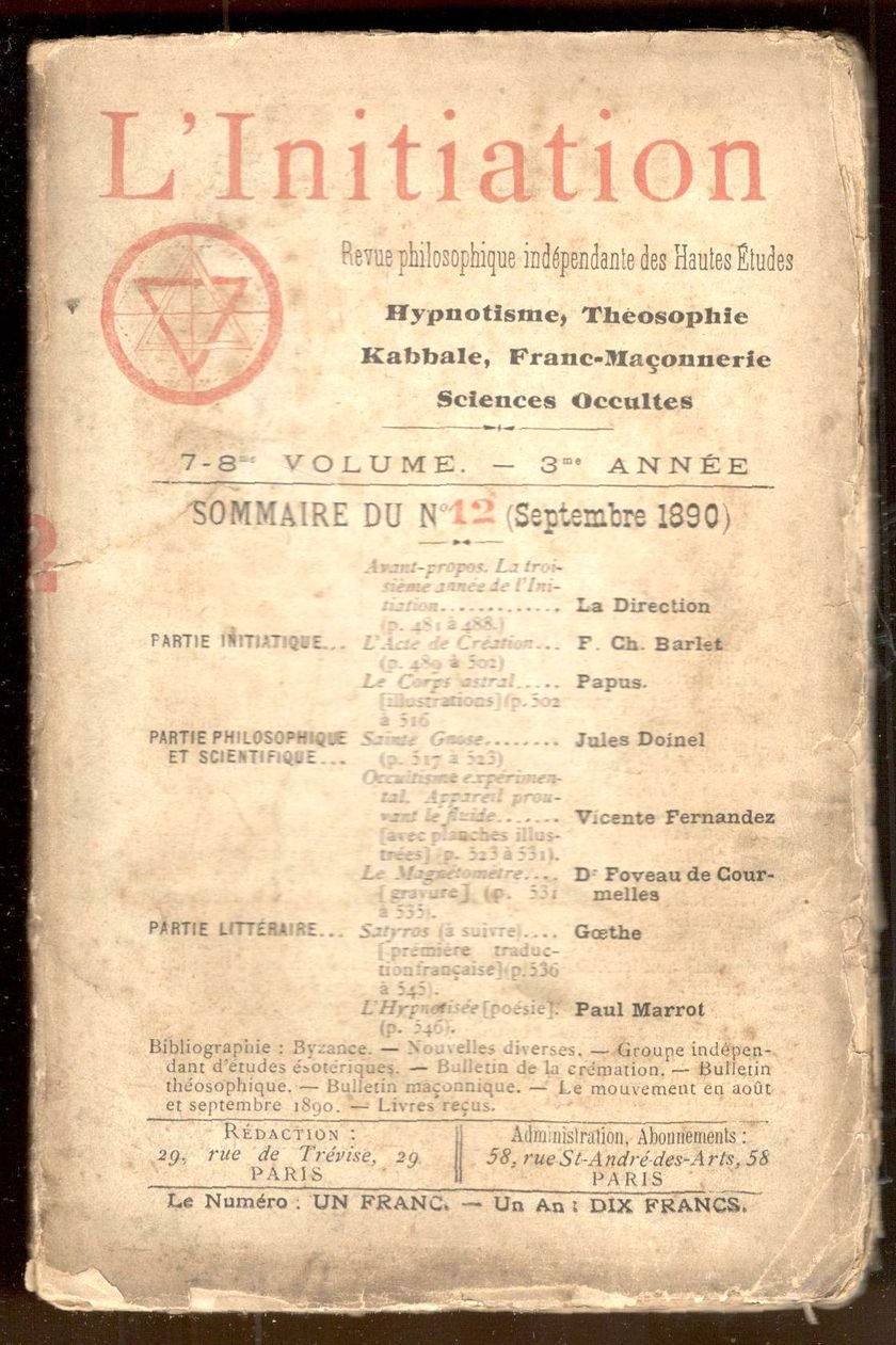 L'Initiation. Revue philosophique indépendante des Hautes Etudes. Hypnotisme, Théosophie, Kabbale, Franc-Maçonnerie, Sciences occultes. 7-8e volume. 3me année. N. 12 (Septembre 1890)