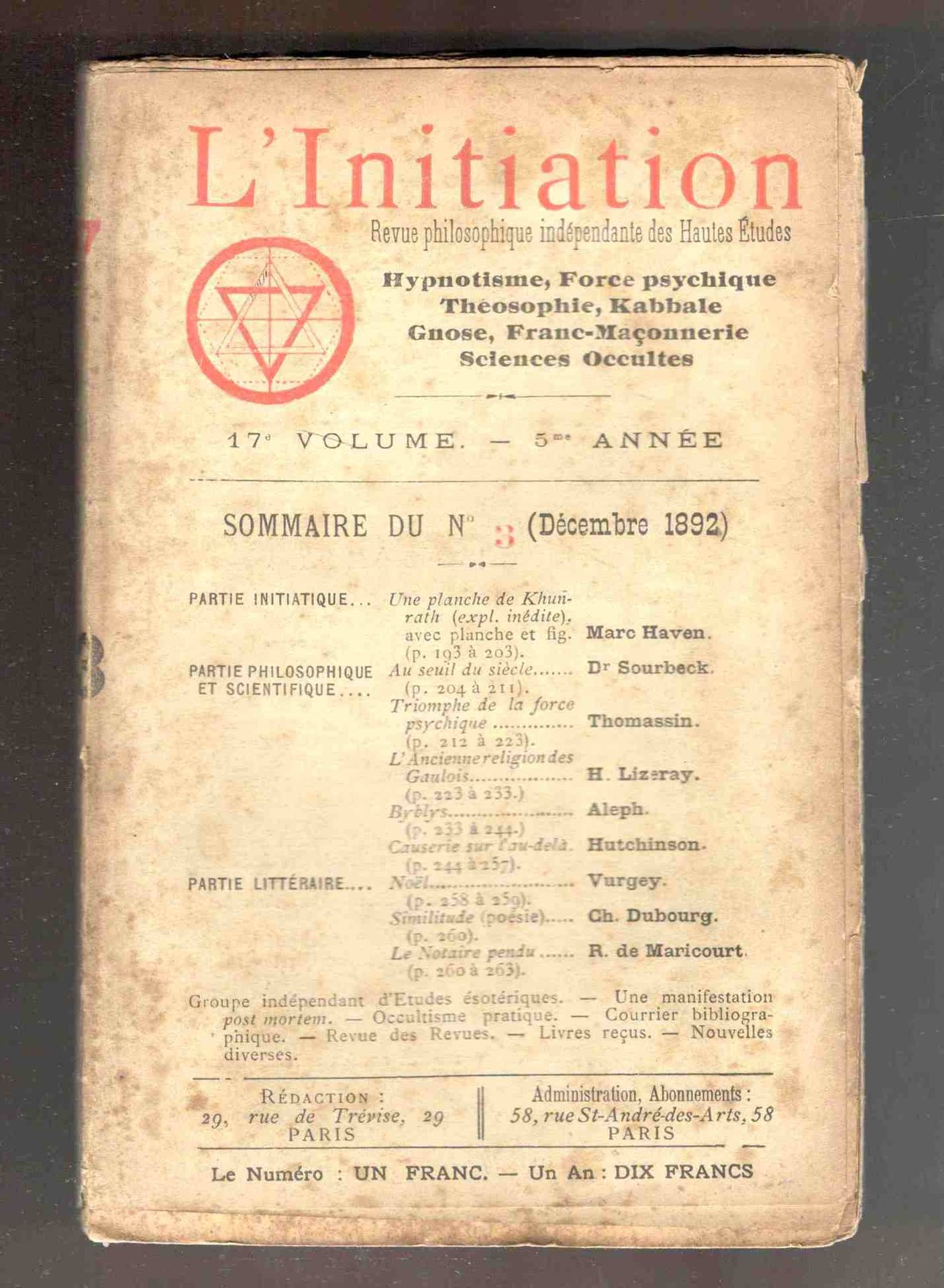 L'Initiation. Revue philosophique indépendante des Hautes Etudes. Hypnotisme, Théosophie, Kabbale, Franc-Maçonnerie, Sciences occultes. 17e volume. 5e année. N. 3 (Décembre 1892)