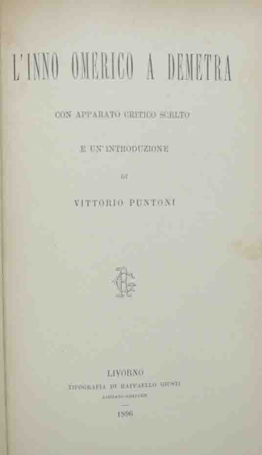 L’inno omerico a Demetra, con apparato critico scelto e un’introduzione di Vittorio Puntoni, Tipografia di Raffaello Giusti Libraio-Editore, Livorno 1896, pp. VIII, 165, cm 23, legatura in mezza tela con titoli al dorso. Firma d’appartenenza, luogo e data alla prima pagina. Minime abrasioni ai piatti e al dorso, sporadiche fioriture, carta lievemente brunita, per il resto esemplare molto ben conservato.