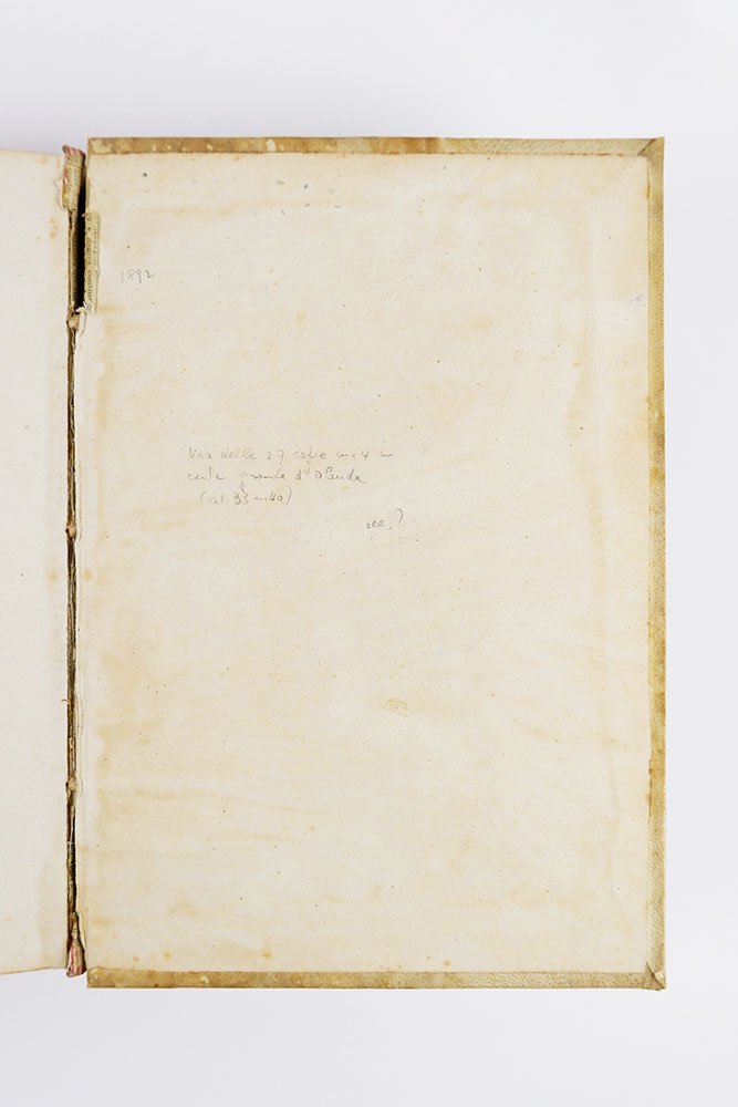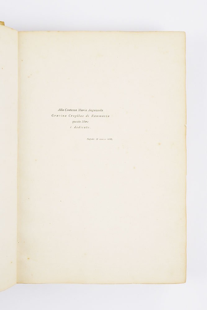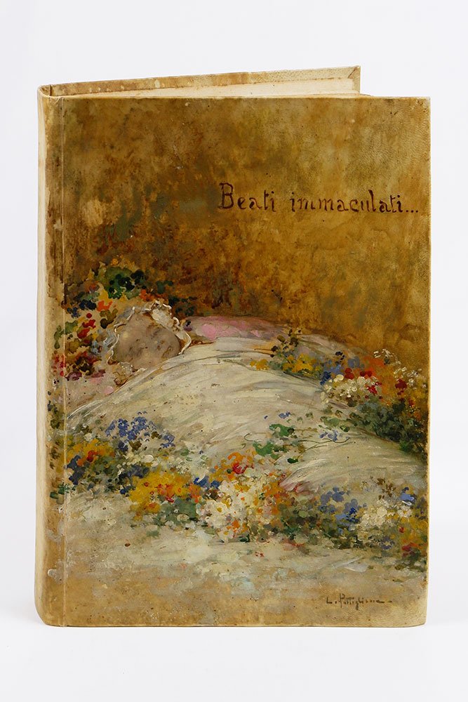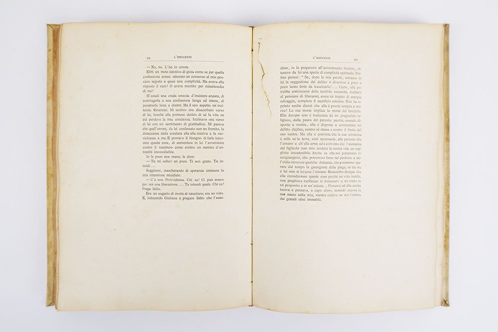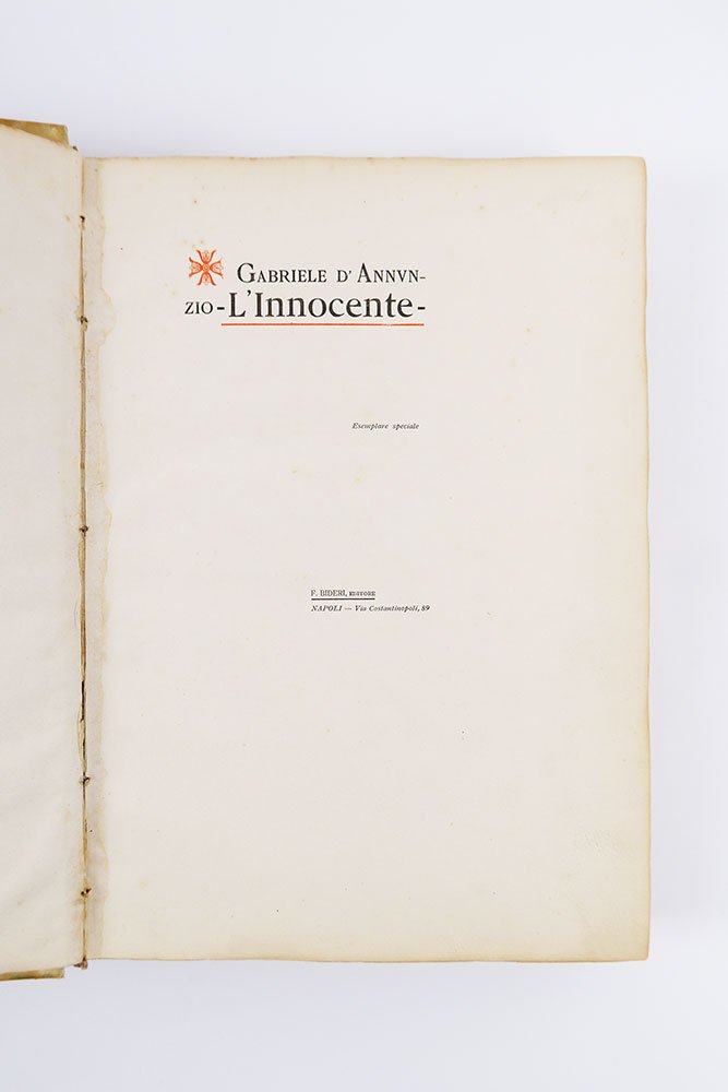 LIBRO Prima edizione, tiratura di testa. Ottimo esemplare (cerniere interne parzialmente fessurate, ma ben solido). In fase di legatura, verosimilmente per volontà dell'illustre possessore Carlo Ceriana-Mayneri (1886-1960, generale dell'Esercito italiano nonché conte dell'omonima casata; suo l'ex libris al contropiatto anteriore), furono rimossi gli ultimi due fogli, uno bianco e l'altro con il nome del compratore stampato dall'editore. -- La bellissima legatura rende l'esemplare qui presentato un oggetto assolutamente unico: il pittore napoletano Luca Postiglione orna infatti il piatto anteriore con un olio raffigurante un infante, l'innocente vittima della storia, che dorme sereno in letto di fiori. In alto, l'epigrafe del romanzo «Beati immaculati.», in basso la firma dell'artista. Postiglione (1876-1936) è stato un apprezzato pittore napoletano a cavallo tra Otto e Novecento: «di famiglia d'artisti, fu istradato alla pittura dal fratello Salvatore, del quale ha ereditato la grande facilità produttiva» e oggi alcuni suoi affreschi sono ancora visibili al celebre Caffè Gambrinus di Napoli. Il presente esemplare è esattamente quello censito al n. 16c del catalogo «Gabriele D’Annunzio» (Libreria Antiquaria Pregliasco, Torino, 1996), punto di riferimento bibliografico per i collezionisti. Oltre ai mille esemplari recanti al frontespizio l'indicazione «Prima edizione», Bideri allestì, con le stesse forme (eccetto il disegno di Sartorio, che fu rimosso), pochi esemplari detti “speciali”: «Di questo esemplare», ci informa l'explicit della prima edizione, «sono stati stampati per i bibliofili 29 esemplari su carta a mano (formato folio, stile sec. XV) al prezzo di lire venticinque ognuno, con impresso a stampa il nome del compratore». -- Secondo romanzo di D’Annunzio e secondo dei tre «Romanzi della rosa», trilogia che comprende anche «Il piacere» (Treves, 1889) e «Il trionfo della morte» (Treves, 1894). Scritto nel corso del 1891 e pubblicato a puntate sul «Corriere di Napoli» nell’inverno 1891-1892, quando l’autore viveva a Napoli, «L’innocente» fu rifiutato da Treves perché giudicato immorale (lo stesso giudizio che l’editore milanese aveva riservato al «Piacere», pentitosi in seguito alla stampa di averlo pubblicato). D’Annunzio si rivolse quindi a Bideri, editore noto per i suoi caratteri e il suo impaginato elegantissimi, che ne fecero negli anni Novanta lo stampatore più raffinato di Napoli. L’editore stampò 1000 esemplari della prima tiratura, detta «prima edizione»; quindi nello stesso 1892 ne uscirono altre quattro edizioni stereotipe, secondo Guabello di cinquecento esemplari cadauna, secondo Vecchioni di mille esemplari. -- Il romanzo è significativamente dedicato «alla contessa Maria Anguissola Gravina Cruyllas di Rammacca», nobile siciliana sposata e madre di quattro figli, con cui l’autore ebbe in quel periodo una storia d’amore adulterina che provocò scandalo e che interruppe solo sul finire del 1892. Gli elementi della vita privata del poeta confluirono vistosamente nel romanzo, costruito intorno a un adulterio: il protagonista Tulio Hermil è infatti in gran parte identificabile con lo stesso autore, come Andrea Sperelli del «Piacere». Tradotto in francese come «L’intrus» nello stesso 1892, «L’innocente» ebbe un successo immediato che allargò la fama di D’Annunzio oltre i confini italiani e che lo riportò a pubblicare con Treves. L’editore comprò le copie invendute di Bideri e le ripubblicò con diversa copertina e con un nuovo frontespizio nel 1895, indicando «quinta edizione». Guabello, Raccolta dannunziana, 66.